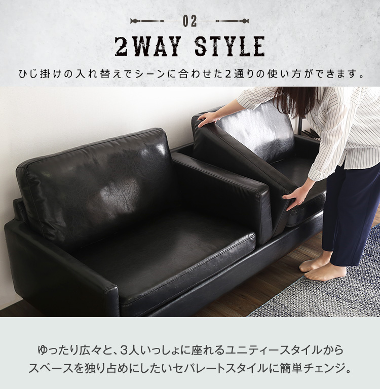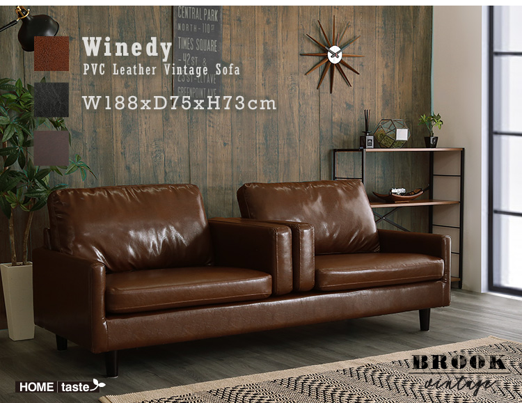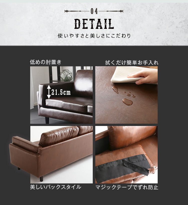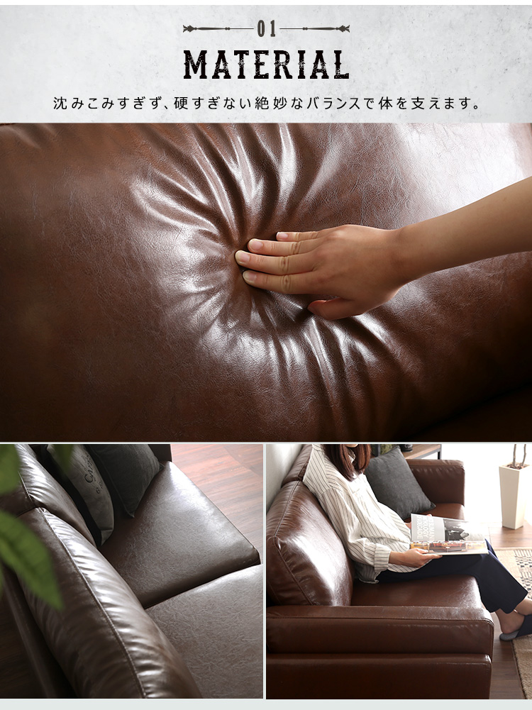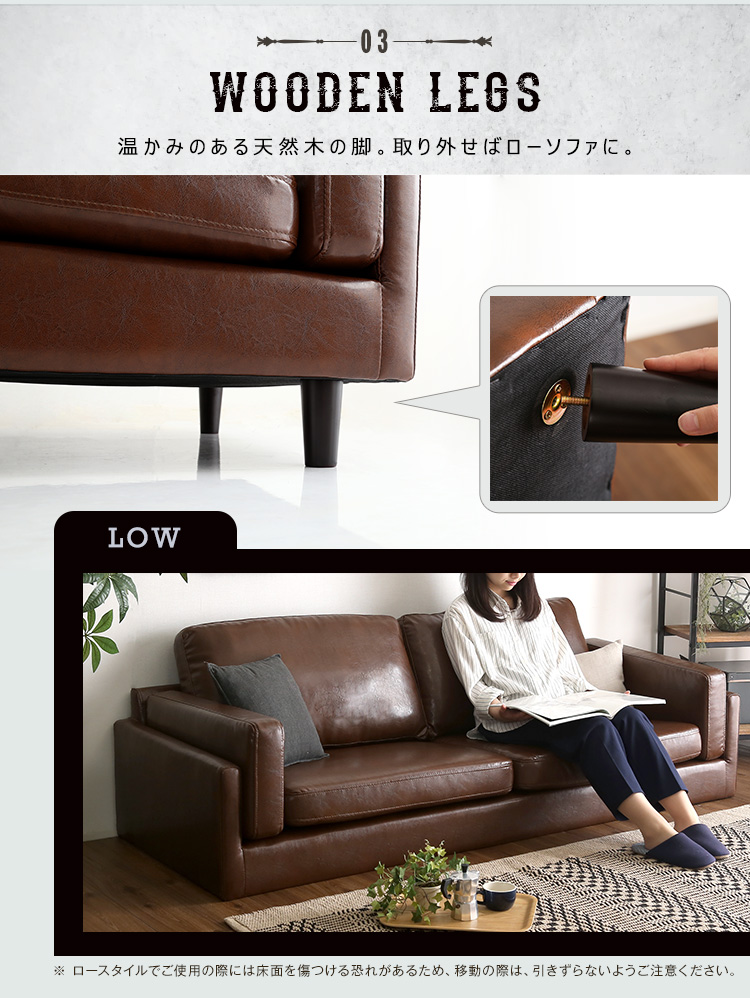 ゆったり座れる3人掛けヴィンテージPVCソファ!羽毛のような柔らかさのシリコンフィルを使用しているので、柔らかくも硬すぎることもなく絶妙な座り心地です。天然木の脚を取り外せばロータイプのソファにもできます!肘掛けを入れ替えればセパレートスタイルに早変わりできます。少しの汚れや水分であれば拭き取るだけの簡単にお手入れ可能です!