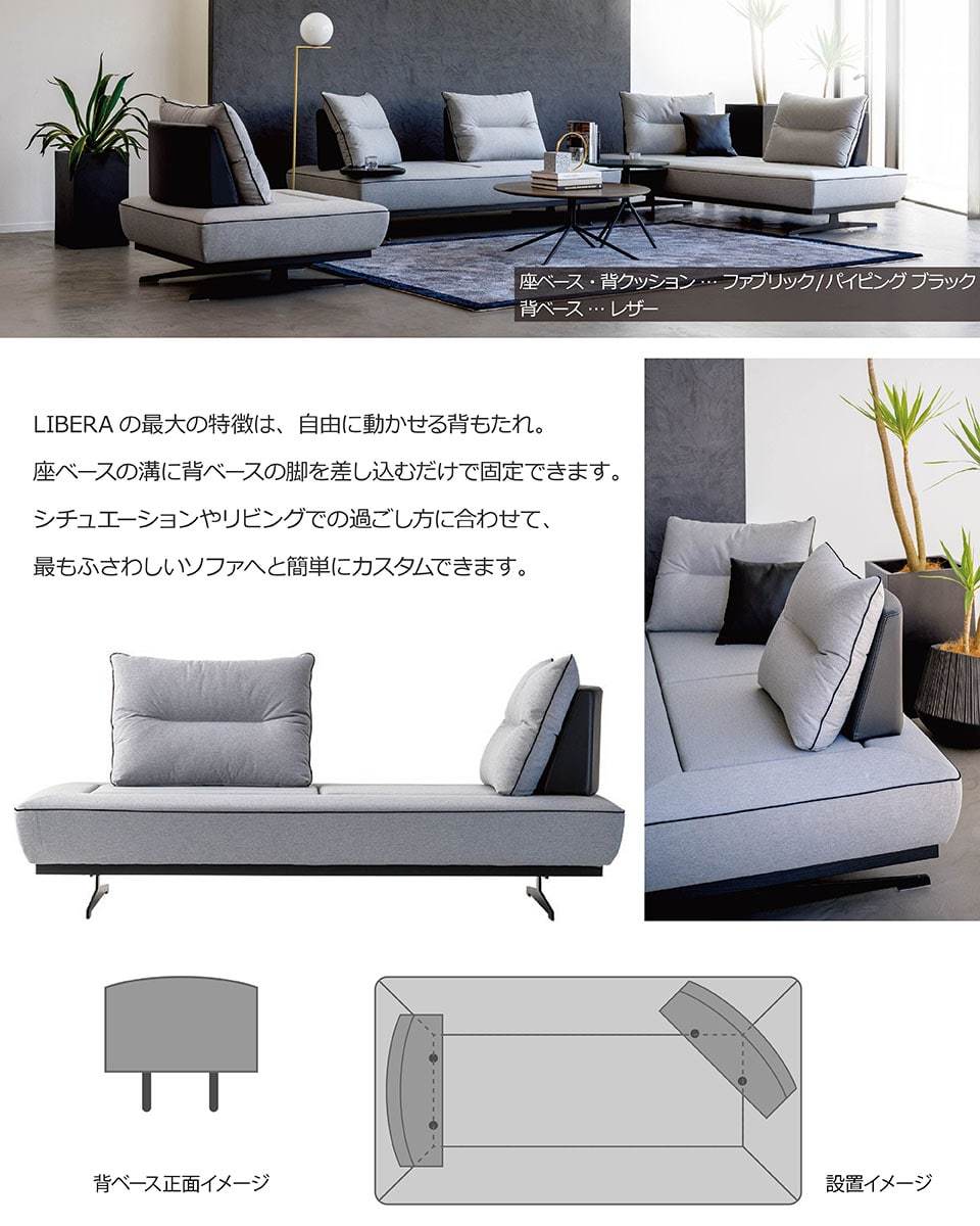 自由を意味する「リベラ」は、シートのスリット部に背ベースを差し込んで多彩な座りが演出できるフレキシブルなソファです。