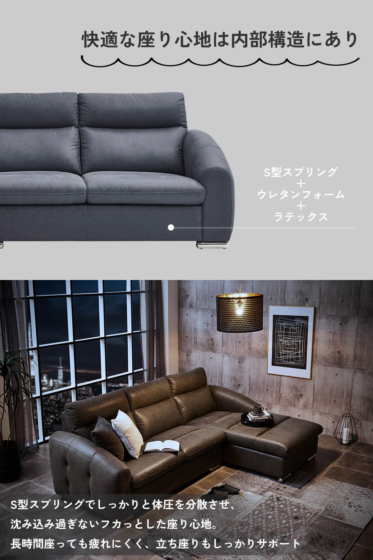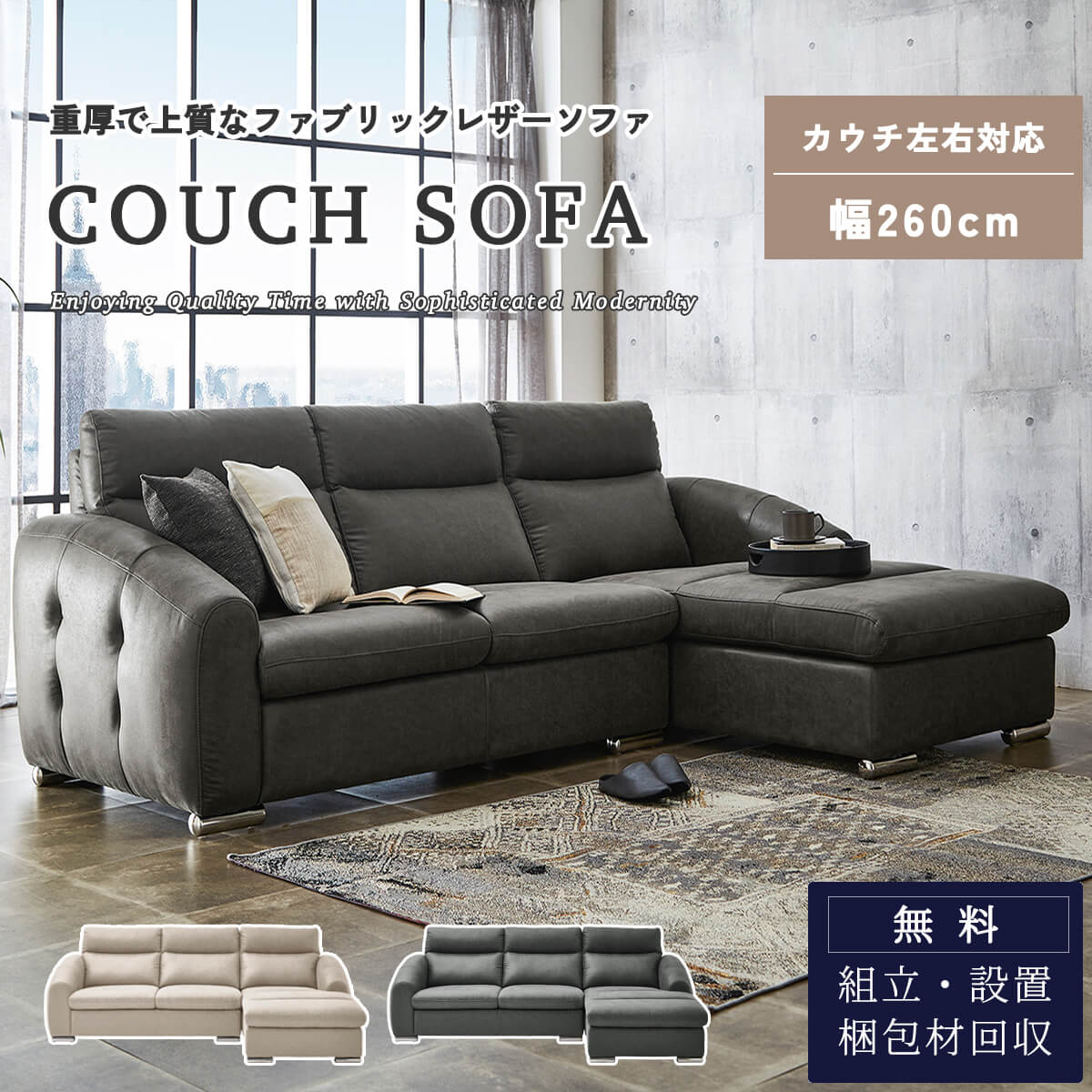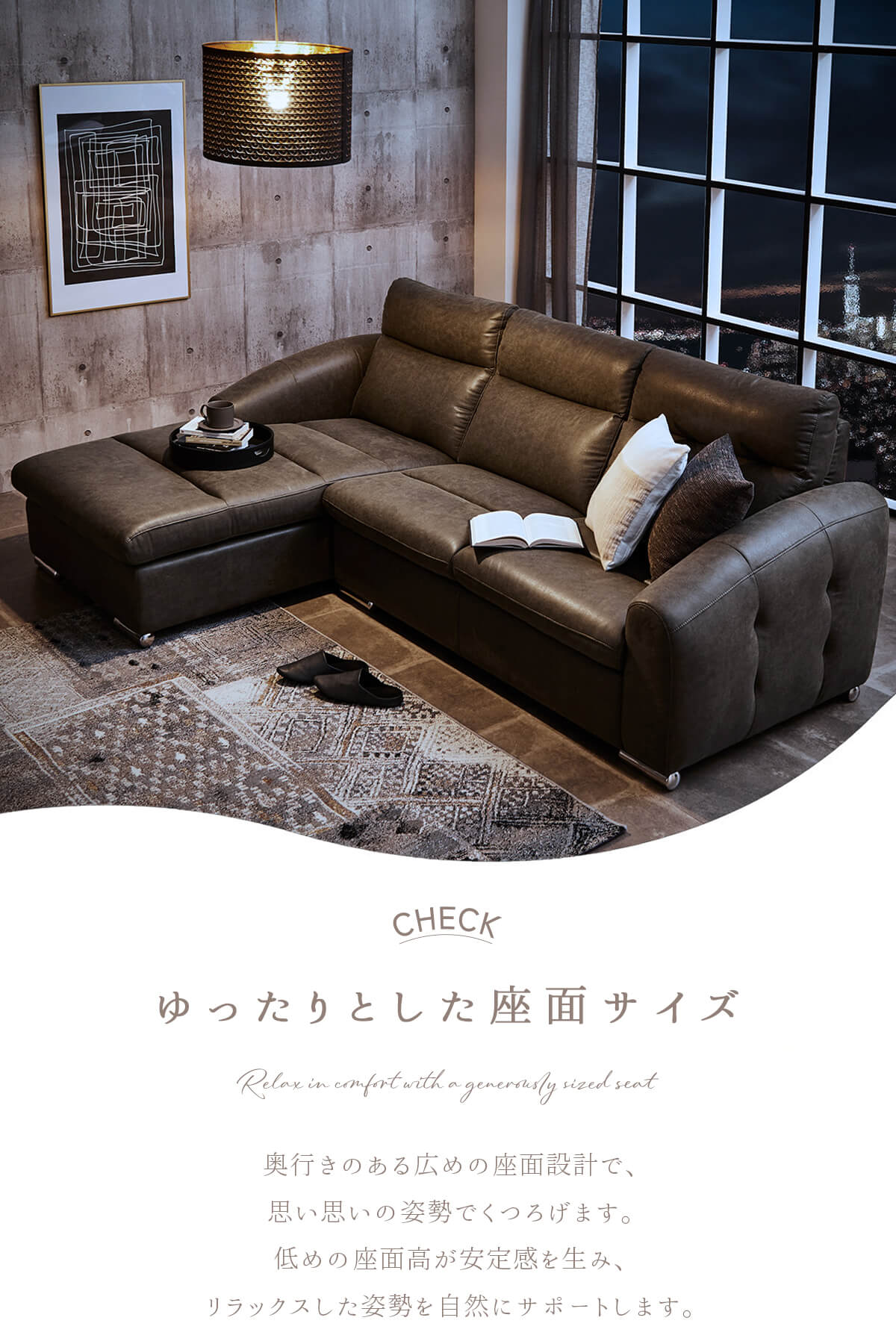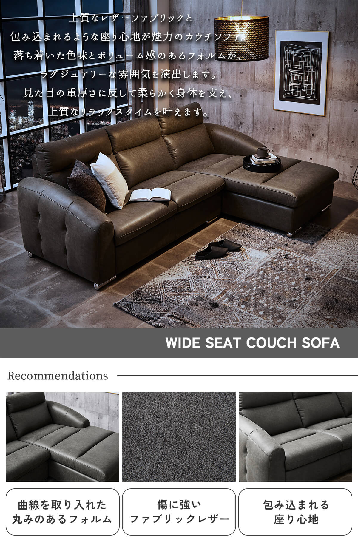 上質なレザーファブリックと包み込まれるような座り心地が魅力のカウチソファ。