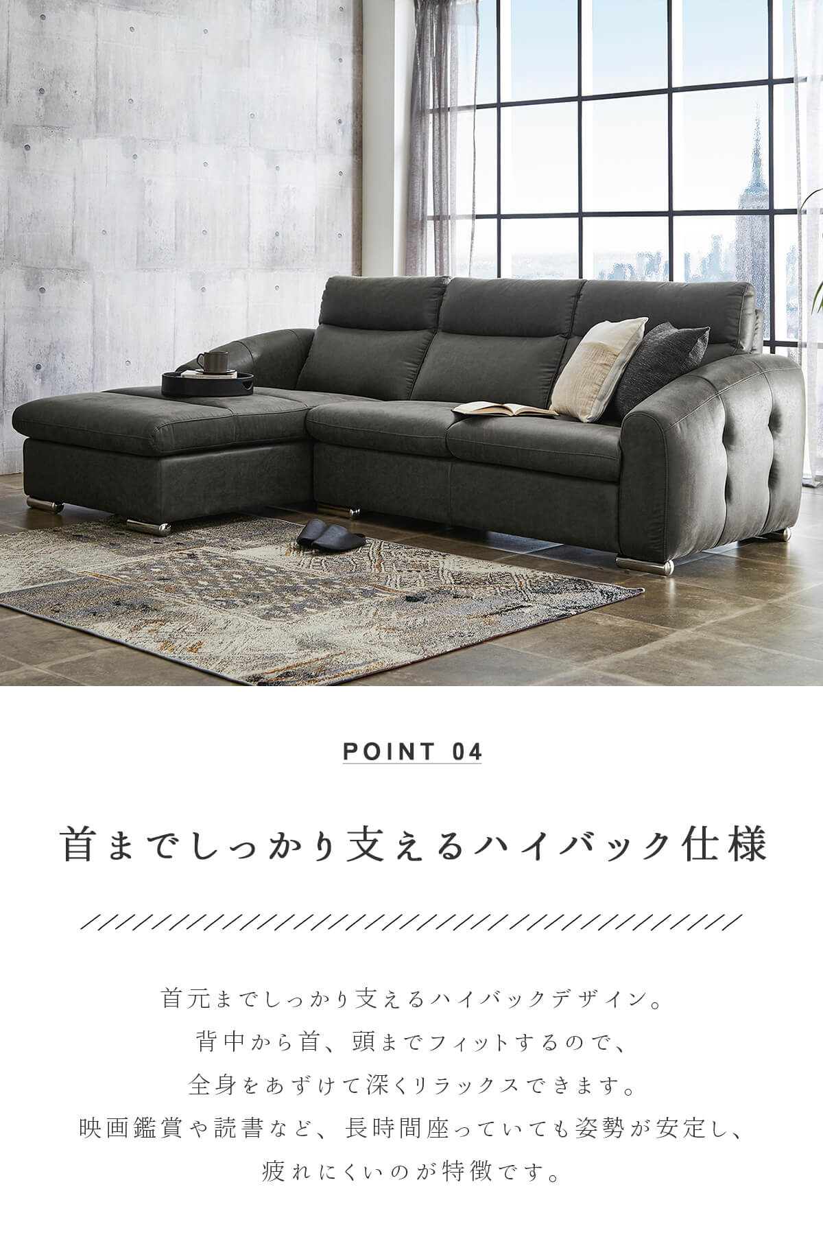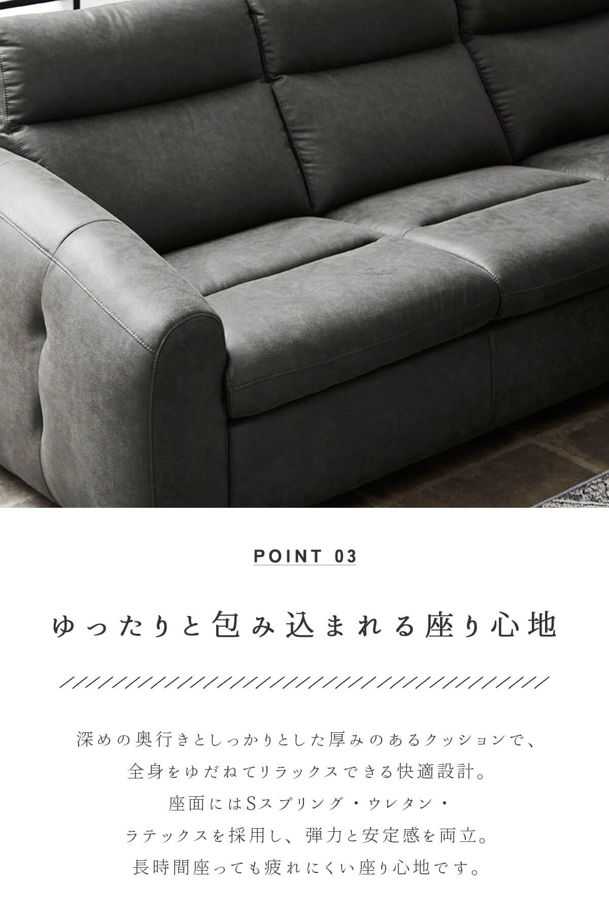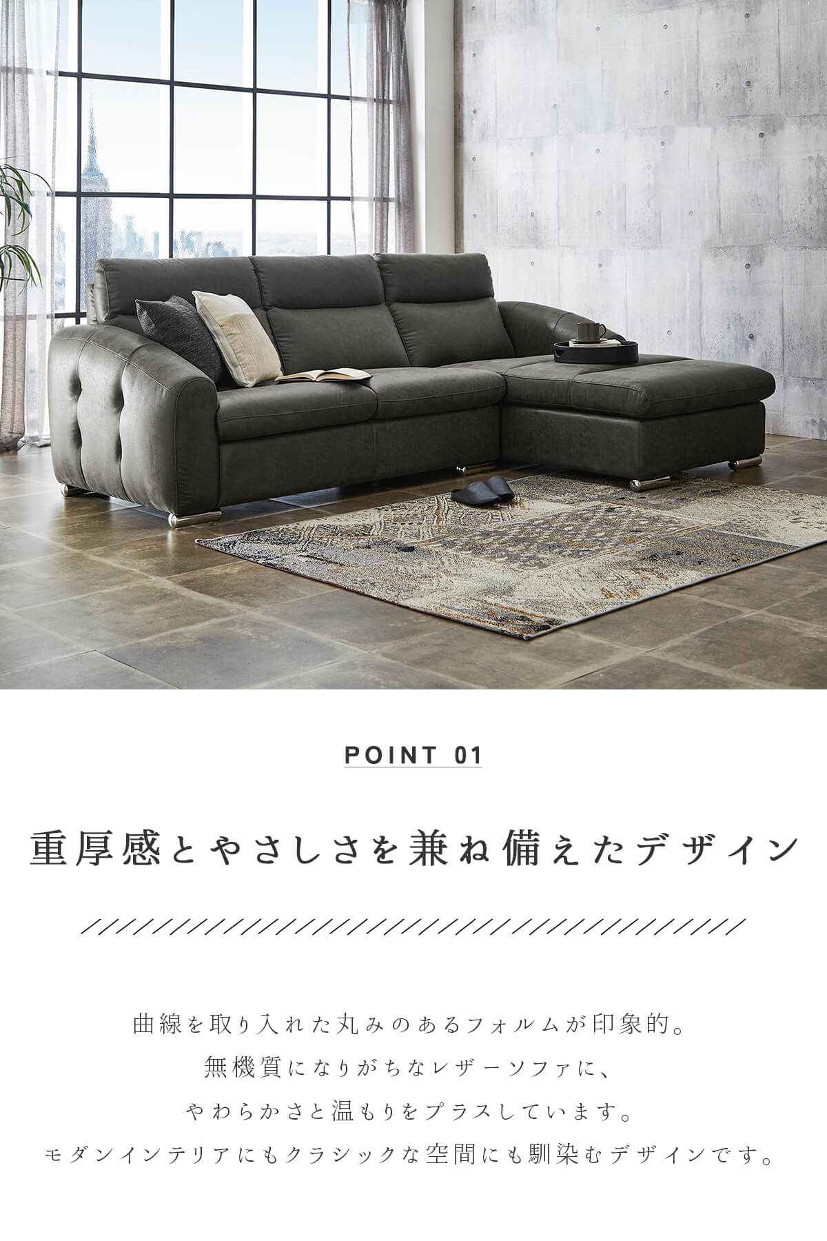 上質なレザーファブリックと包み込まれるような座り心地が魅力のカウチソファ。