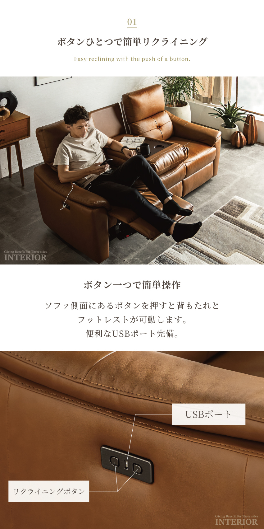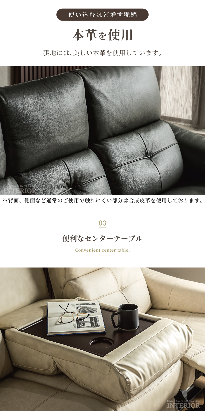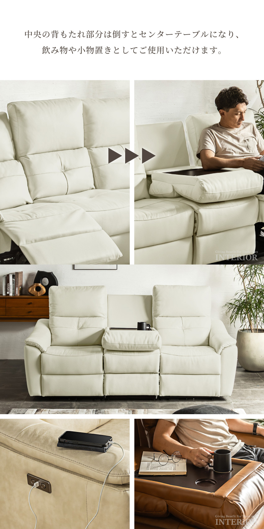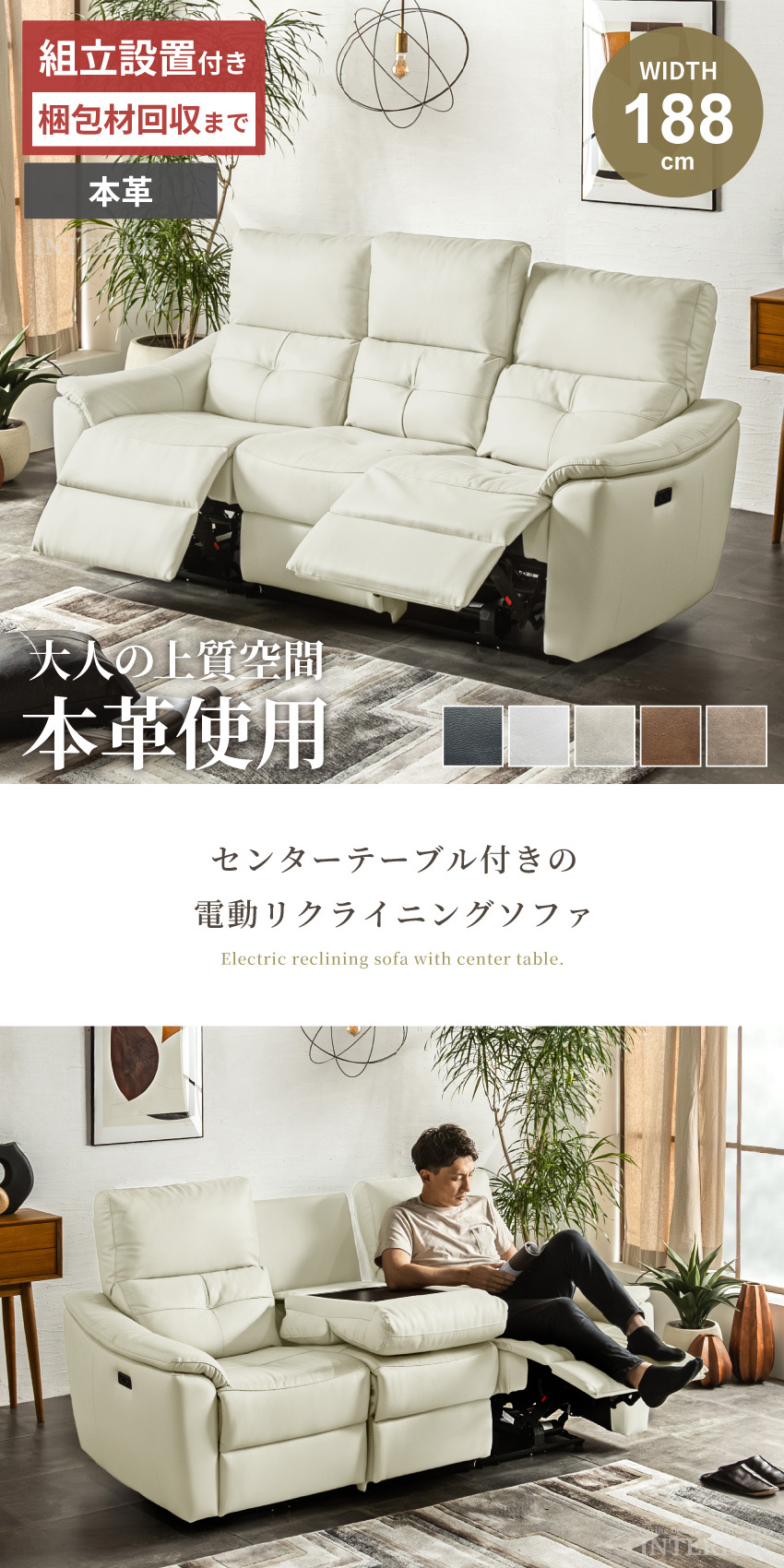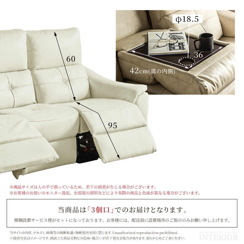 ゆったり座れる幅188cmの電動ソファです。ボタンを押すだけで簡単にリクライニングできます。ボタンにはUSBポートが付いており、座ったままスマートフォンやゲーム機の充電が可能です。張地には本革を使用しており、高級感溢れる仕上がりに。中央部にはドリンクホルダー付きのセンターテーブルを完備しております。