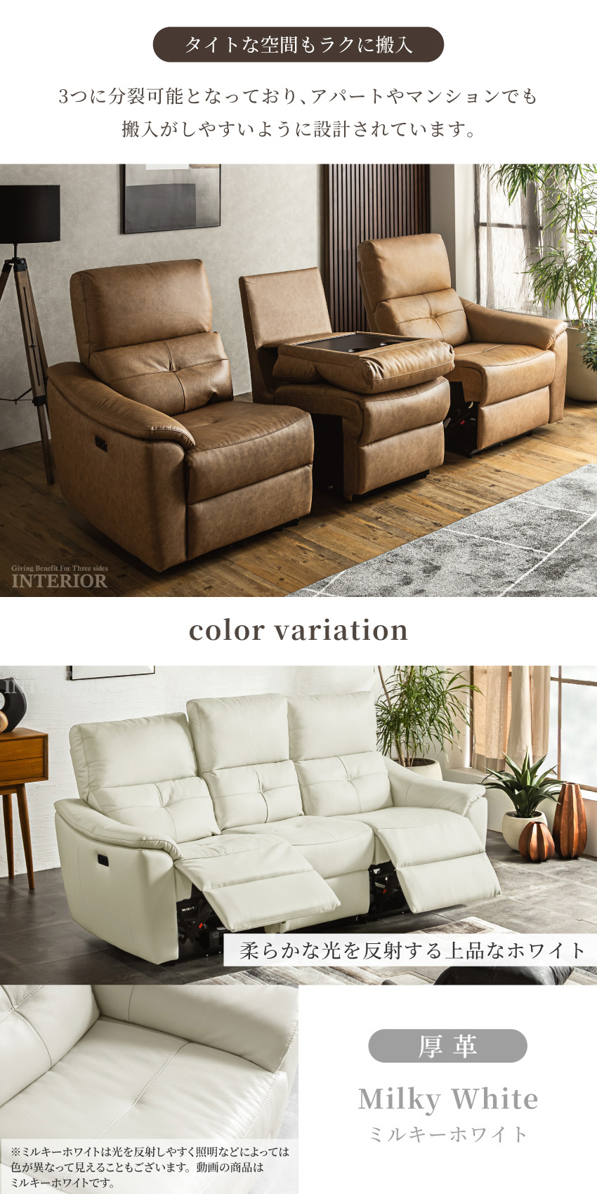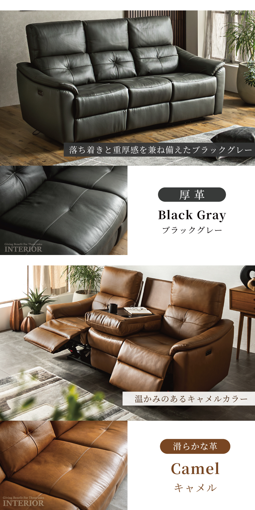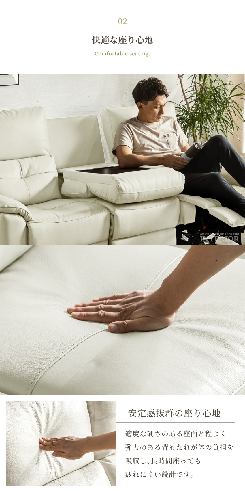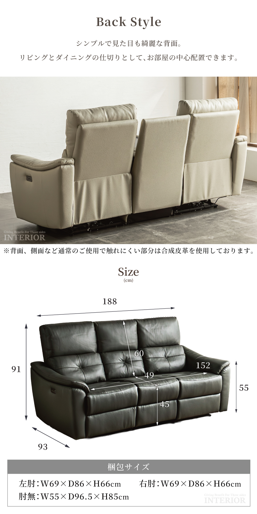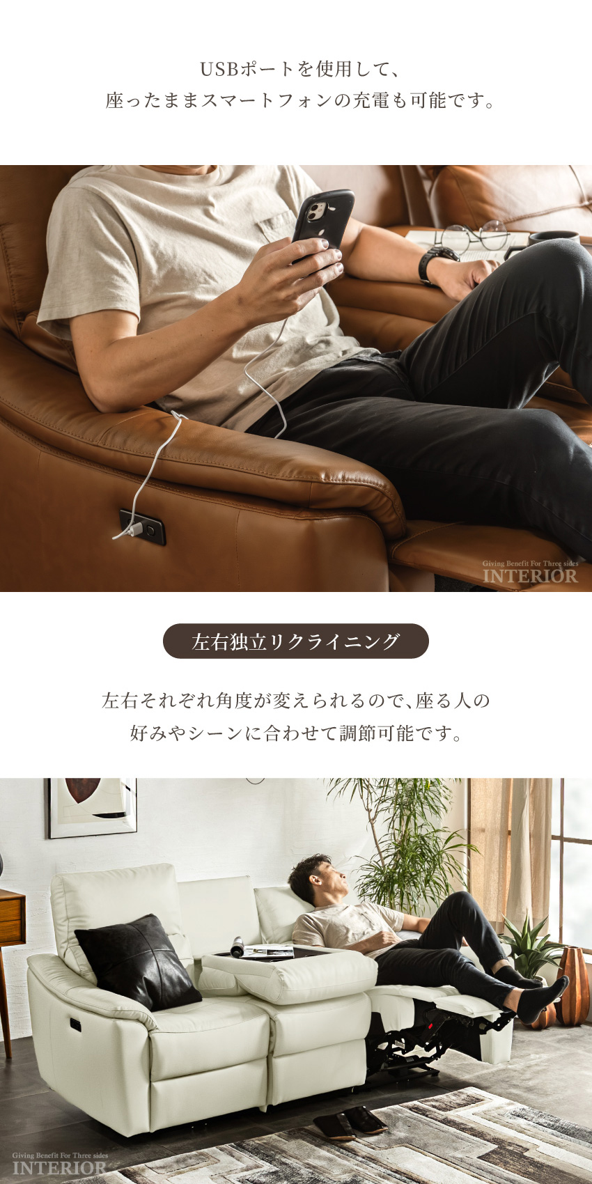 ゆったり座れる幅188cmの電動ソファです。ボタンを押すだけで簡単にリクライニングできます。ボタンにはUSBポートが付いており、座ったままスマートフォンやゲーム機の充電が可能です。張地には本革を使用しており、高級感溢れる仕上がりに。中央部にはドリンクホルダー付きのセンターテーブルを完備しております。