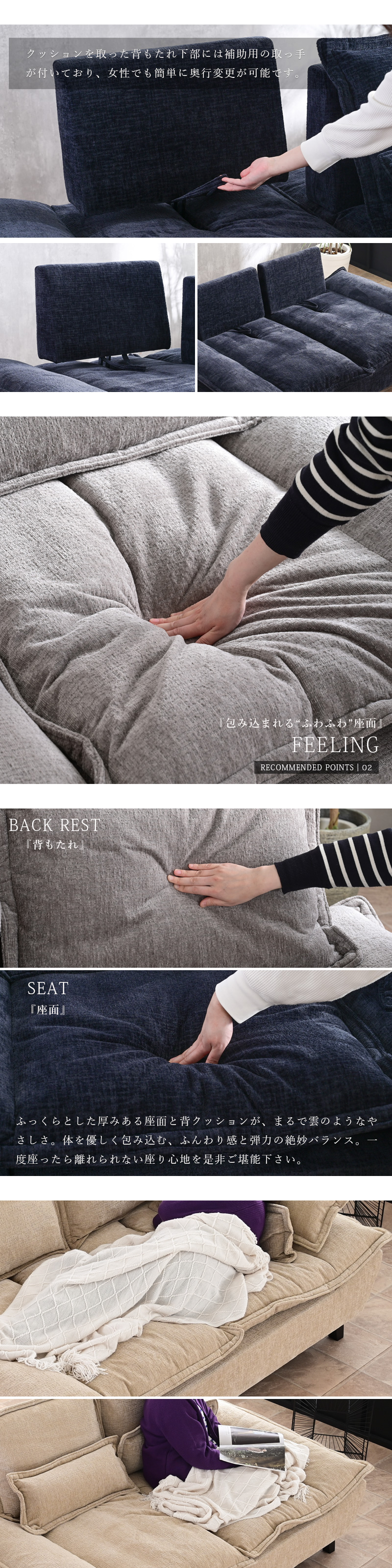 ・背もたれが可動し、奥行を広くで、あぐらをかいたりごろ寝したりゆったり寛げる。