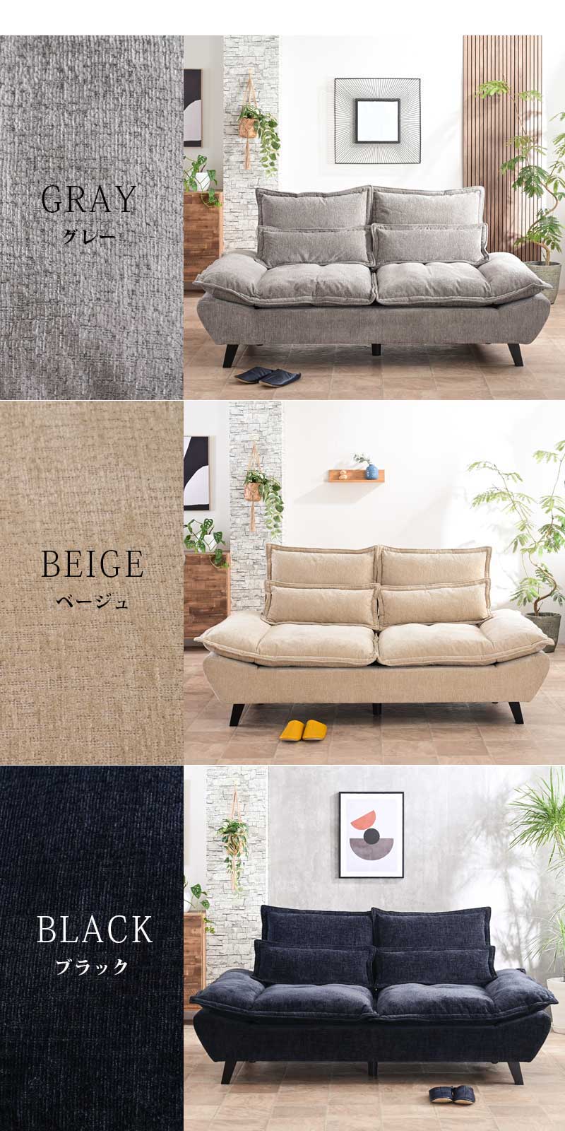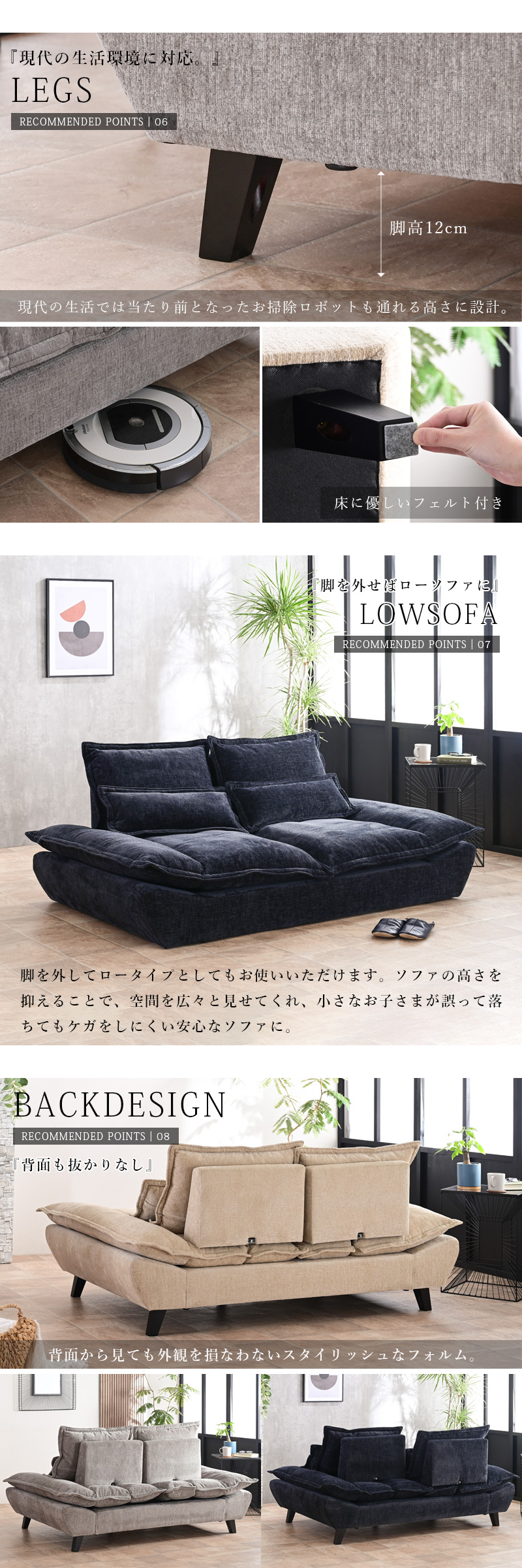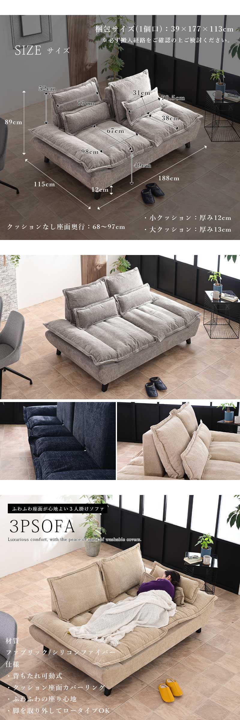 幅188cm ふわふわ座面 ソファー 3Pソファ 3人掛け ソファ 2人掛け 背もたれ可動式 ふかふか ごろ寝 あぐら ファブリック カバーリング ロータイプ ローソファ