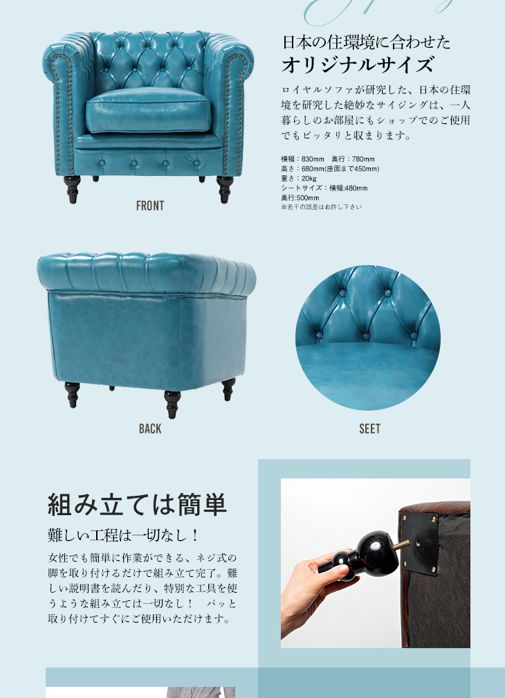 一人暮らし 家具 アンティーク ヴィンテージ ソファ ソファー 一人掛け カフェ 店舗 おしゃれ チェスターフィールド ビンテージ ターコイズ 水色 青色 VC1P49K