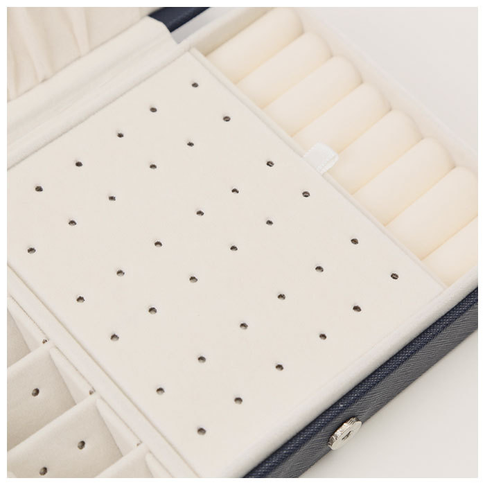 ・ボックス左側には、ピアスの収納に便利な4つ穴のスタッズプレートを合計5枚配置。プレートはひとつひとつ取り外しができ、小さなピアスもバラバラにならないから安心!