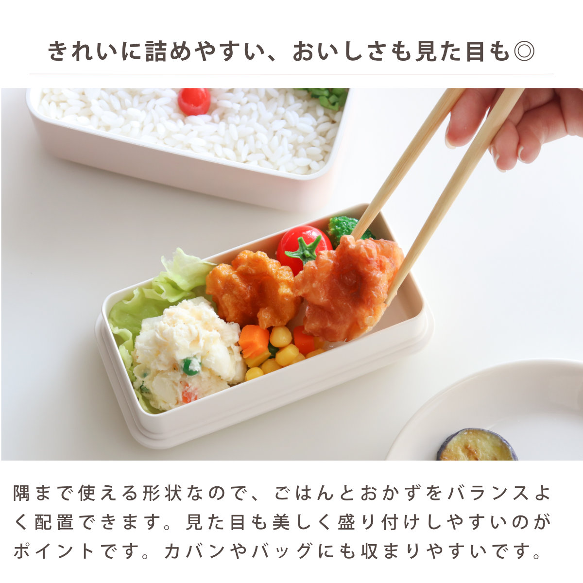 ●隅まで使える形状なので、ごはんとおかずをバランスよく配置できます。