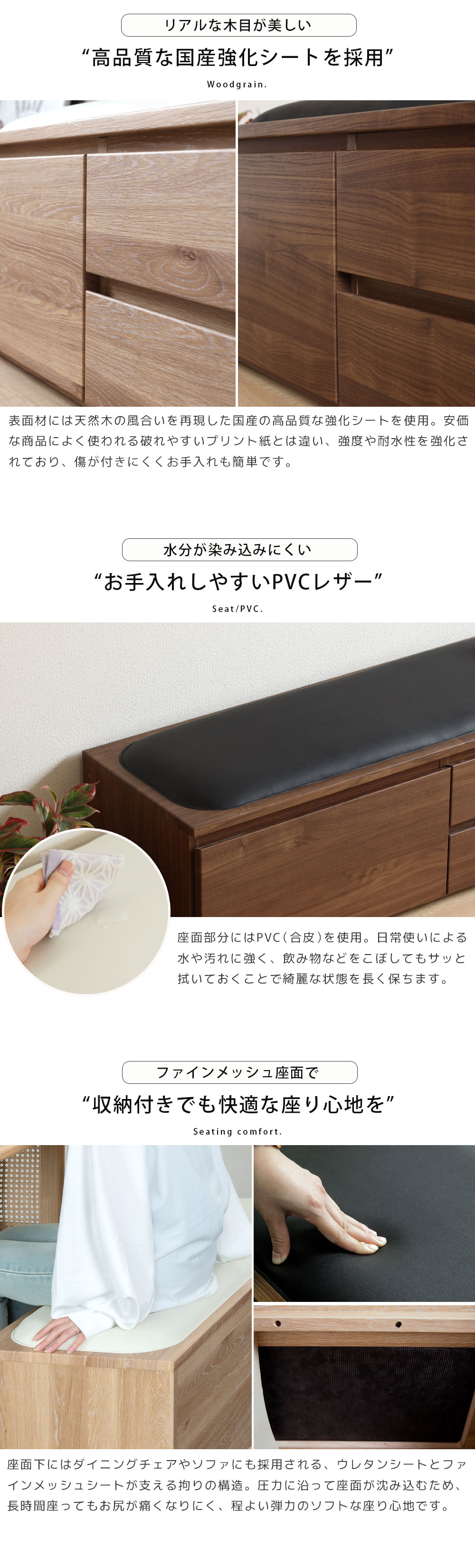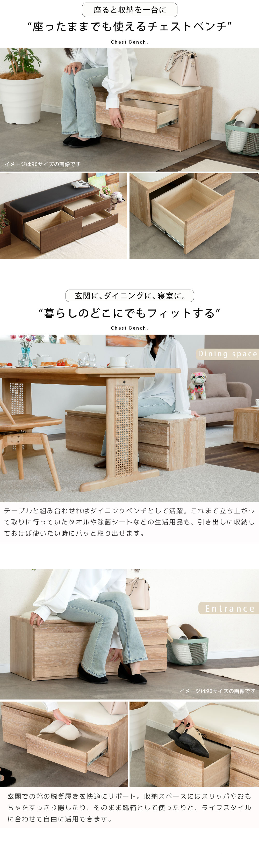 リビングでの頼れる収納付きベンチチェストとしても、玄関内のベンチとしても使いやすいシンプルなデザインが魅力。