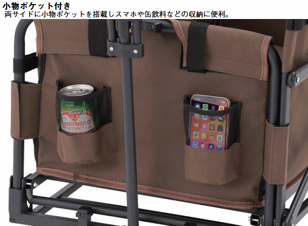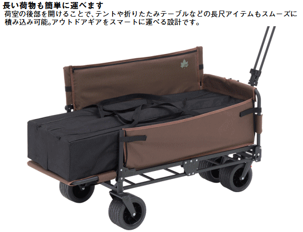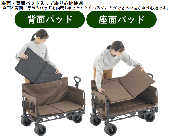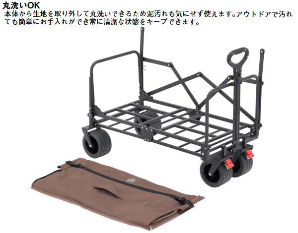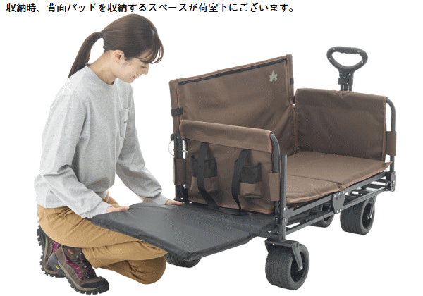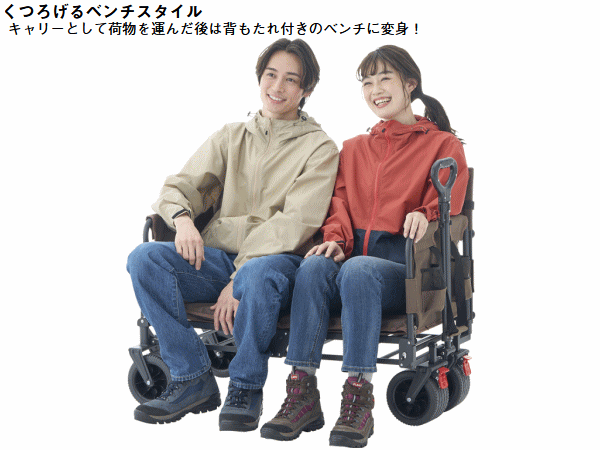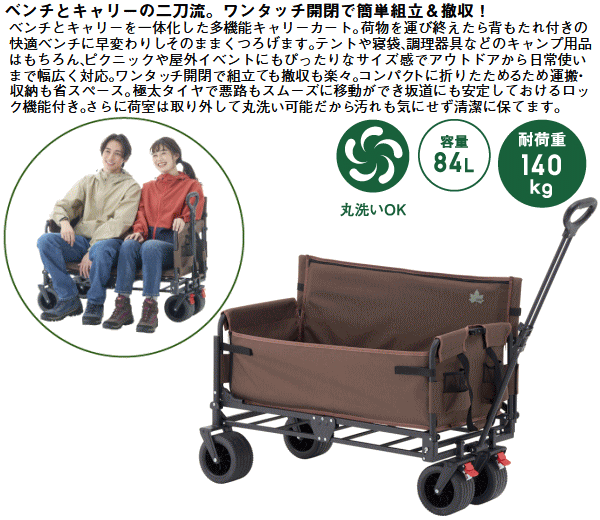 ベンチとキャリーを一体化した多機能キャリーカート。荷物を運び終えたら背もたれ付きの快適ベンチに早変わりしそのままくつろげます。テントや寝袋、調理器具等のキャンプ用品はもちろんピクニックや屋外イベントにもぴったりなサイズ感でアウトドアから日常使いまで幅広く対応。ワンタッチ開閉で組立ても撤収も楽々。コンパクトに折りたためるため運搬・収納も省スペース。両サイドに小物ポケットを搭載しスマホや缶飲料などの収納に便利。ハンドルは長さを無段階に調節できるので楽に運べます。極太タイヤで悪路もスムーズに移動ができ坂道にも安定しておけるロック機能付き。更に荷室は取り外して丸洗い可能だから汚れも気にせず清潔に保てます。■総重量約15.1kg■サイズ約長さ120/98×幅57×高さ72cm(座高32cm)■荷室サイズ約縦84×横40×深さ25cm■ハンドル長約長さ87cm■容量約84L■収納サイズ約縦32×横57×高さ78cm■耐荷重約140kg※耐荷重表記は静止荷重による目安です。容量表記は目安です。 4981325611583