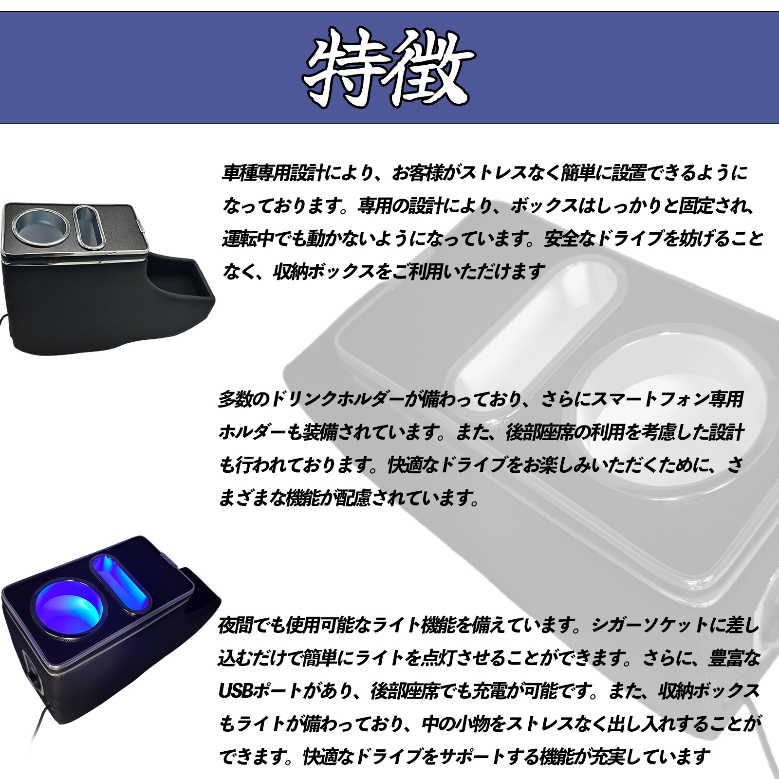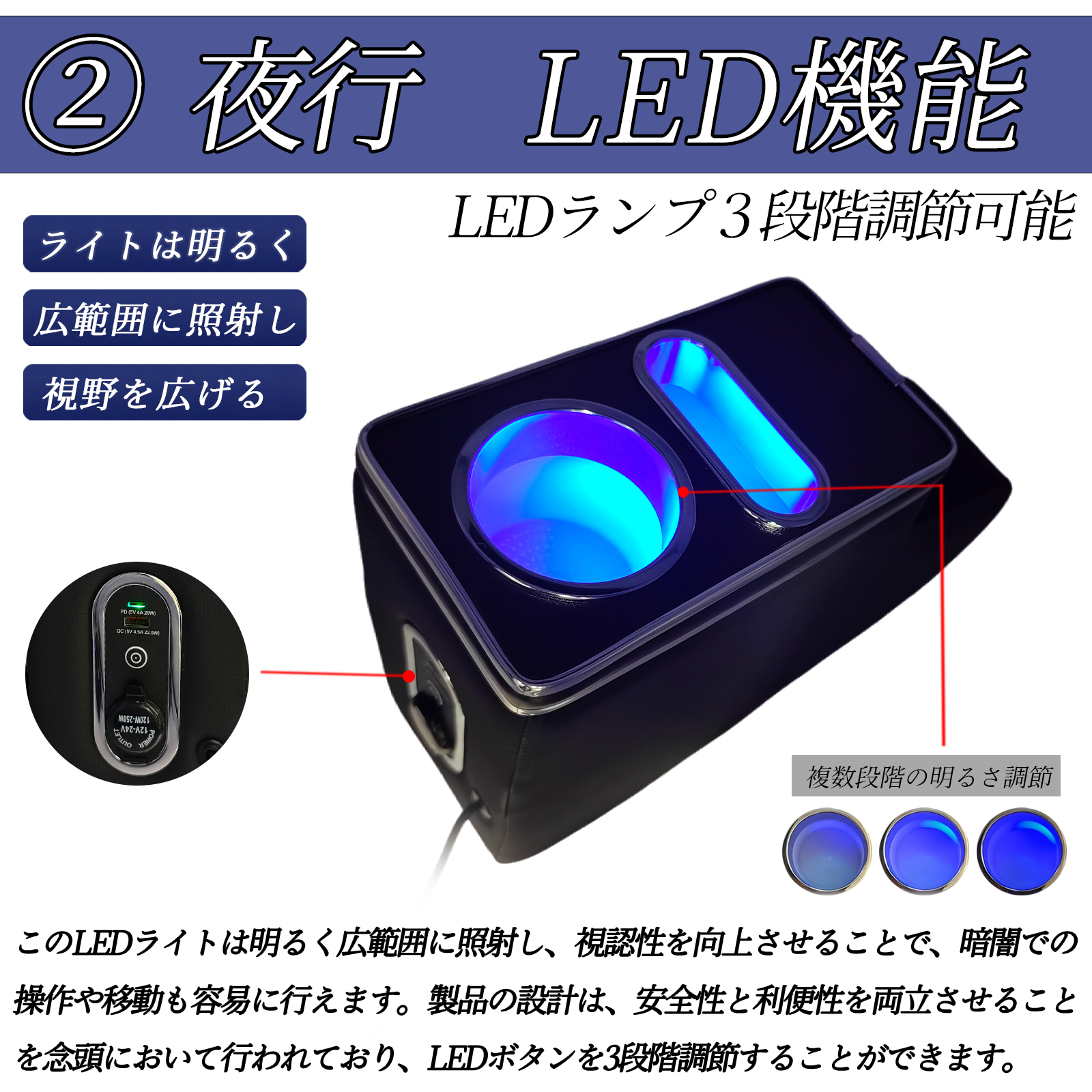 ドリンクホルダーと携帯ホルダーは、クリックで点灯し、さらにクリックで色を変更してグラデーションが楽しめます。