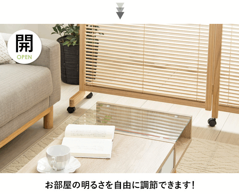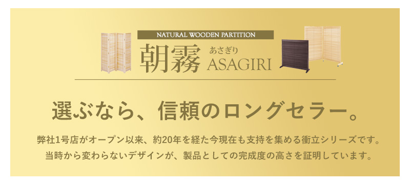 幕板部分がブラインドのように開閉が可能なロングセラー衝立シリーズ「朝霧/ASAGIRI」。お部屋を仕切る、視線を遮るというパーテーション本来の役割を果たしながら、幕板の開閉で光量や風通しが調節できる優れた機能性が人気の理由です。天然木使用で見た目にも高級感のある本体は、軽い素材の桐材を使用しており持ち運びもラクラク。使わない時は折りたたんでおけば、省スペースで収納できます。あたたかみのあるナチュラルと、シックなブラウンの2色展開で、和洋を問わずお洒落にご利用いただけます。
