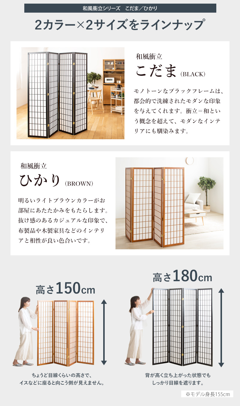 障子風のデザインが和の香り漂う和風衝立シリーズ【和風衝立 こだま/ひかり】。格子の凛とした佇まいは、現代にも通じる和モダンな雰囲気を演出します。衝立、パーテーションとしてお部屋の間仕切りや目隠し以外にも、間接照明と組み合わせてお洒落な空間作りにもおすすめです。幕板は丈夫で破れにくい不織布を使用。透けにくく、差し込む光を柔らかくしてくれます。ブラックとブラウンの2カラー展開で、和洋を問わずインテリアに馴染みます。