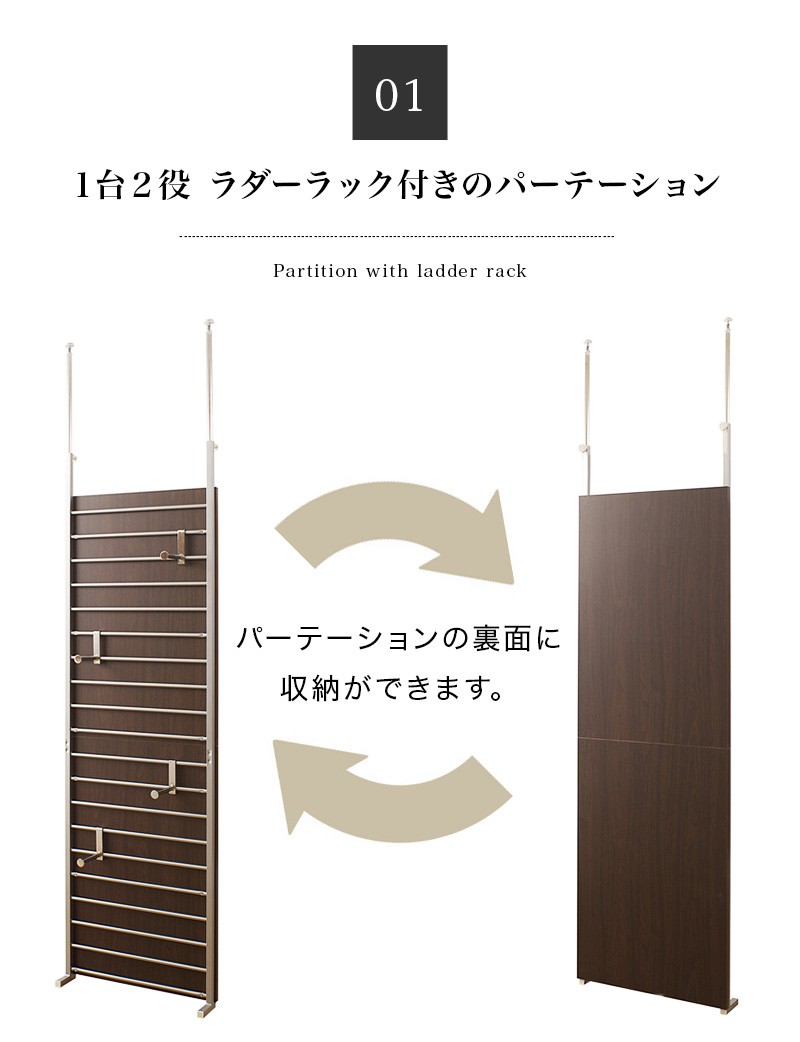 突っ張り パーテーション ハンガーラック おしゃれ フック付き 幅60 送料無料 突っ張り間仕切りラダーラック60cm幅 ナチュラル ホワイト ダークブラウン