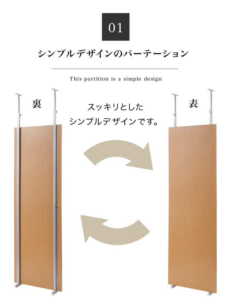 人気のパーテーションシリーズにパネルタイプが登場。シリーズで組み合わせると思い通りのインテリアをコーディネートできます。パネルは上下分割になっていますので片方だけ外して使用もできます。ホワイト・ナチュラル・ダークブラウンの3色をご用意。間仕切ってもよし、壁付けにして一面飾るもよしの使い勝手自在。抜群の安定感 突っ張り式パーテーション