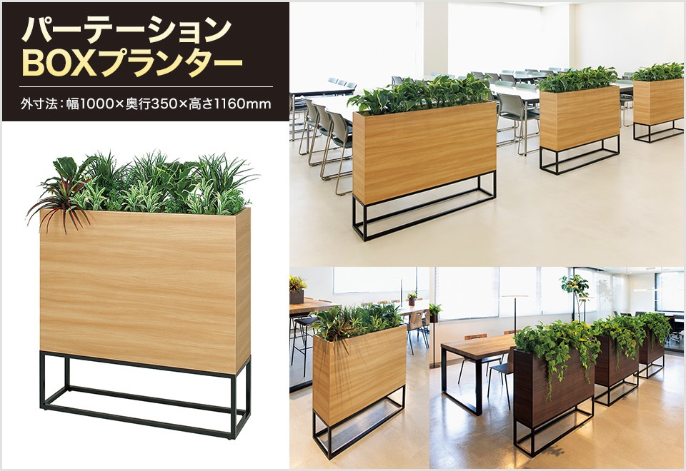 木目のBOXとアイアン風の脚がインテリアに合わせやすいボックスプランターです。スタンダードなデザインで、連接に向いた仕様になっています。フードコートや食堂の通路、テーブルの仕切りやオフィスのロビー、ワークスペースと打ち合せスペースの仕切り、ショップのエスカレーター横に休憩スペースを設ける際の仕切りなど、多くの場所でお使いいただけます。人工グリーンなのでお手入れ不要、手軽で衛生的です。