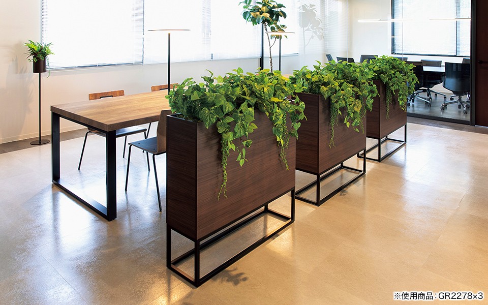 フードコートや食堂の通路、テーブルの仕切りやオフィスのロビー、ワークスペースと打ち合せスペースの仕切りなど、多くの場所でお使いいただけます。人工グリーンなのでお手入れ不要、手軽で衛生的です。