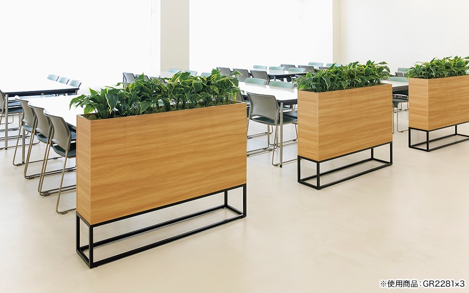 フードコートや食堂の通路、テーブルの仕切りやオフィスのロビー、ワークスペースと打ち合せスペースの仕切りなど、多くの場所でお使いいただけます。人工グリーンなのでお手入れ不要、手軽で衛生的です。