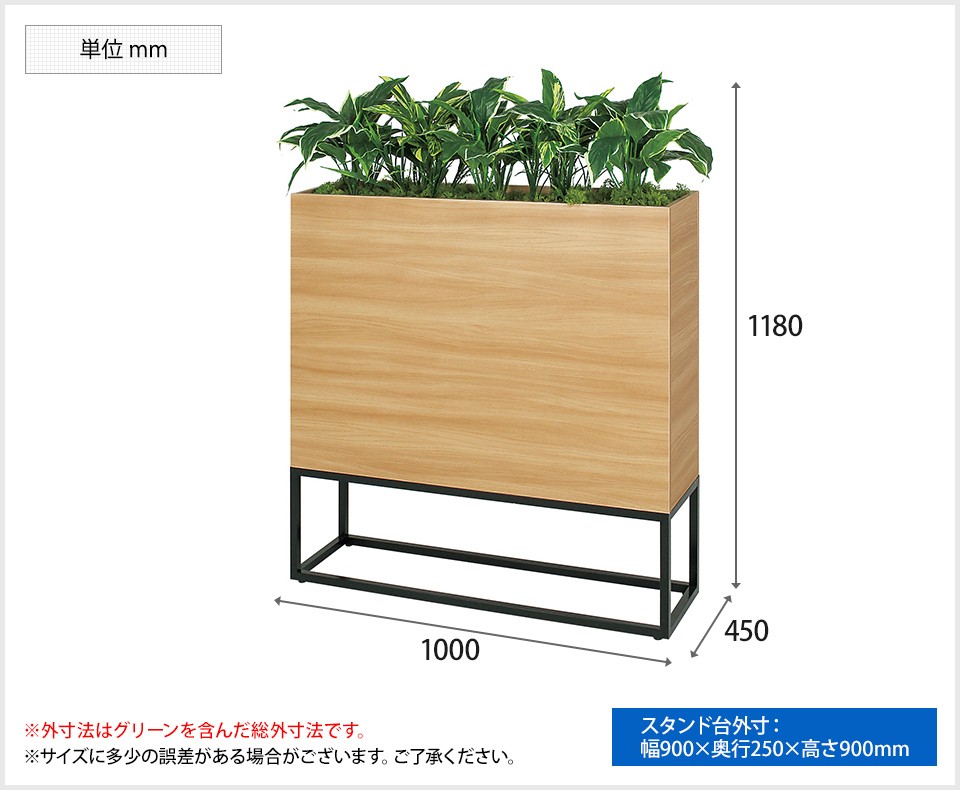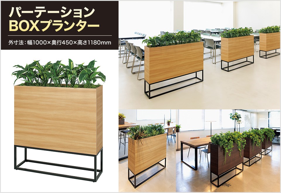 木目のBOXとアイアン風の脚がインテリアに合わせやすいボックスプランターです。スタンダードなデザインで、連接に向いた仕様になっています。フードコートや食堂の通路、テーブルの仕切りやオフィスのロビー、ワークスペースと打ち合せスペースの仕切り、ショップのエスカレーター横に休憩スペースを設ける際の仕切りなど、多くの場所でお使いいただけます。人工グリーンなのでお手入れ不要、手軽で衛生的です。