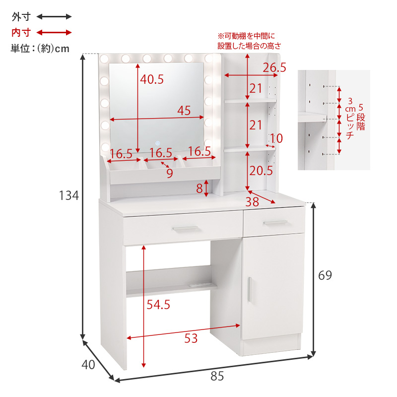 ドレッサー ライト付き 白 鏡台 シンプル コスメ コンセント スツール デスク 机 おしゃれ ホワイト 収納 ワンルーム コンパクト スリム ノエル