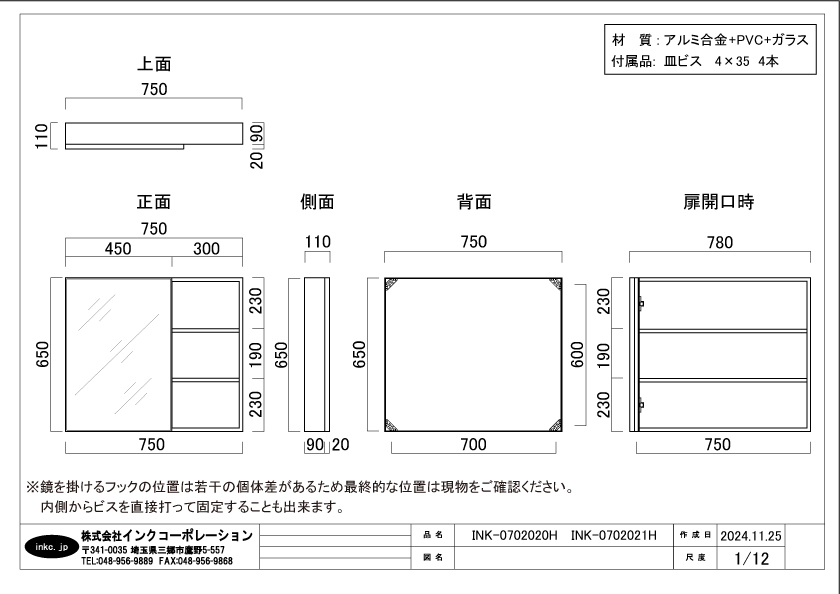 仕様 サイズ 幅:750mm 奥行き:110mm 高さ:650mm 重量 約4.2kg 素材 ガラス アルミ合金 PVC セット内容 本体 ビス 発注単位 1個より 備考