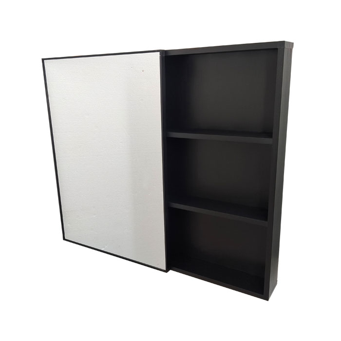 三段ある棚が鏡の裏まで続くユニークな作りになっています。