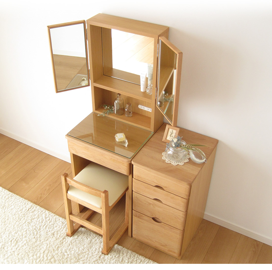 ・ドレッサーとスツールのみの販売です。サイドチェストや撮影用小物等は含まれておりません。