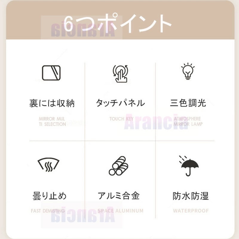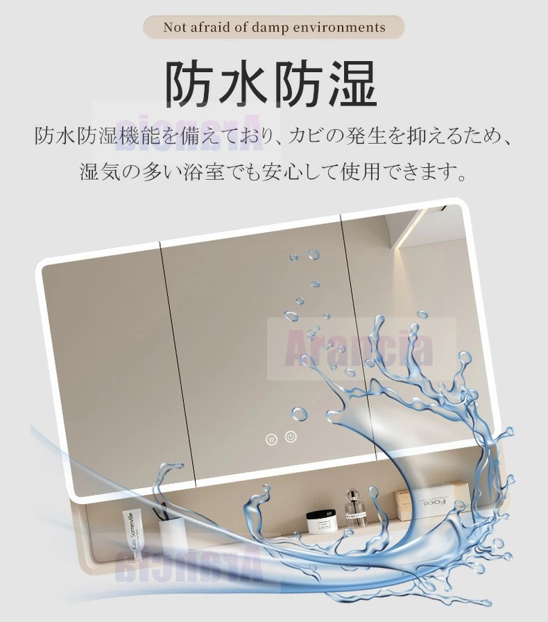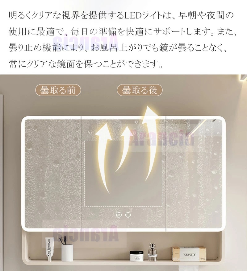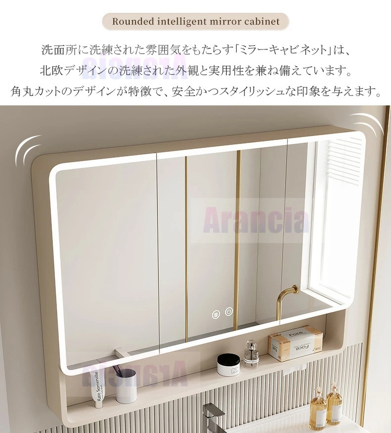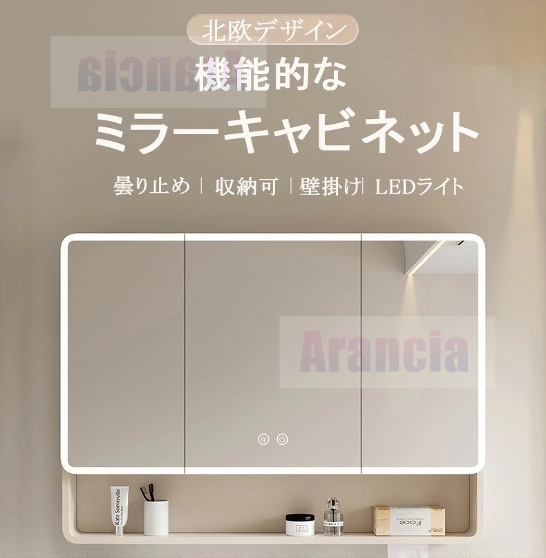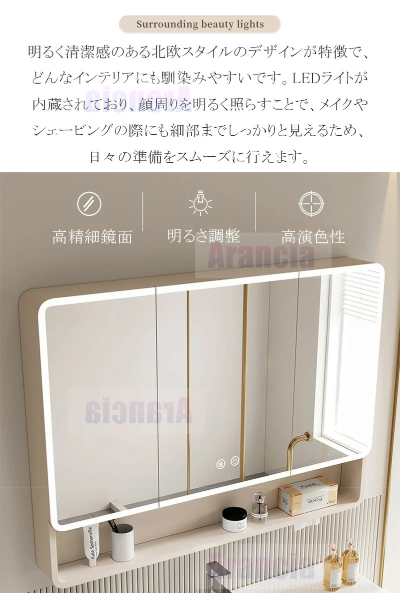 LED照明が内蔵されているため、明るくクリアな視界を提供し、日々のお手入れやメイクアップ時にも最適です。また、収納スペースも充実しており、洗面用品や小物をすっきりと整理できます。三面鏡の設計は使い勝手が良く、角度を調整して全方位から自分をチェックできます。