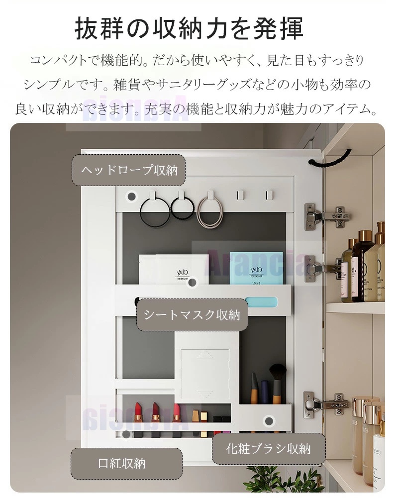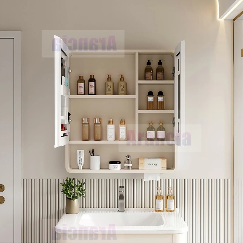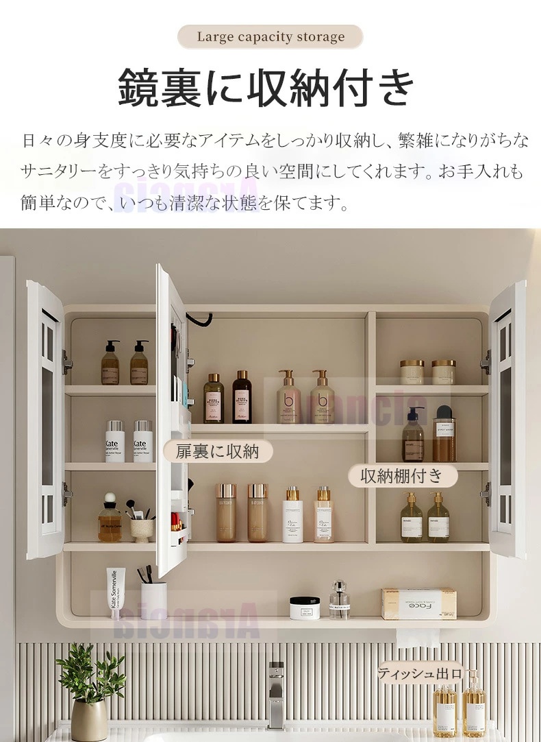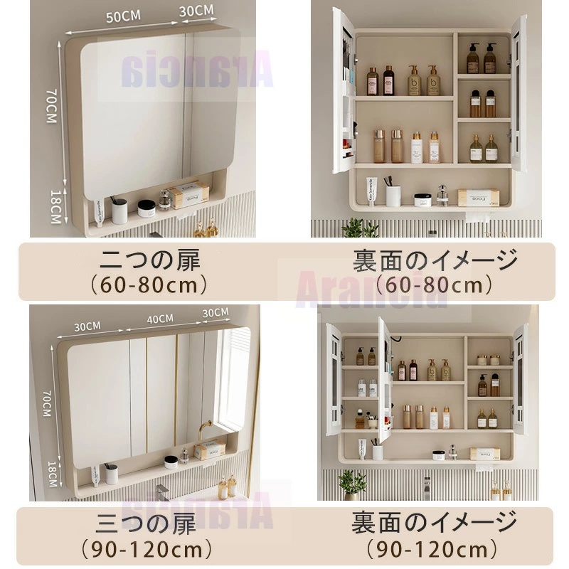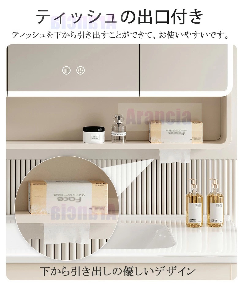 鏡の裏には収納スペースが設けられており、洗面用品や小物をすっきりと整理できます。この収納機能により、カウンタートップを常に整理整頓された状態に保つことが可能です。毎日のルーチンを快適にし、洗面所をもっと機能的で美しい空間に変えることができるでしょう。