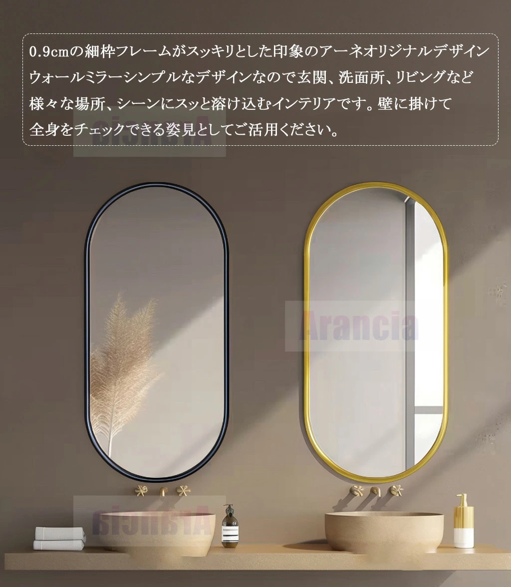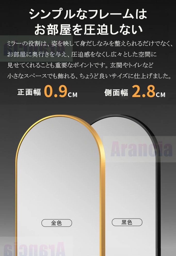 ・洗練されたデザインと機能性で、あらゆる空間に洗練された印象をもたらします。金色の枠がエレガントな雰囲気を演出し、北欧スタイルのインテリアにもぴったりです。全身が映る大きさで、玄関やリビング、美容室など、多様な場所での使用が想定されています。