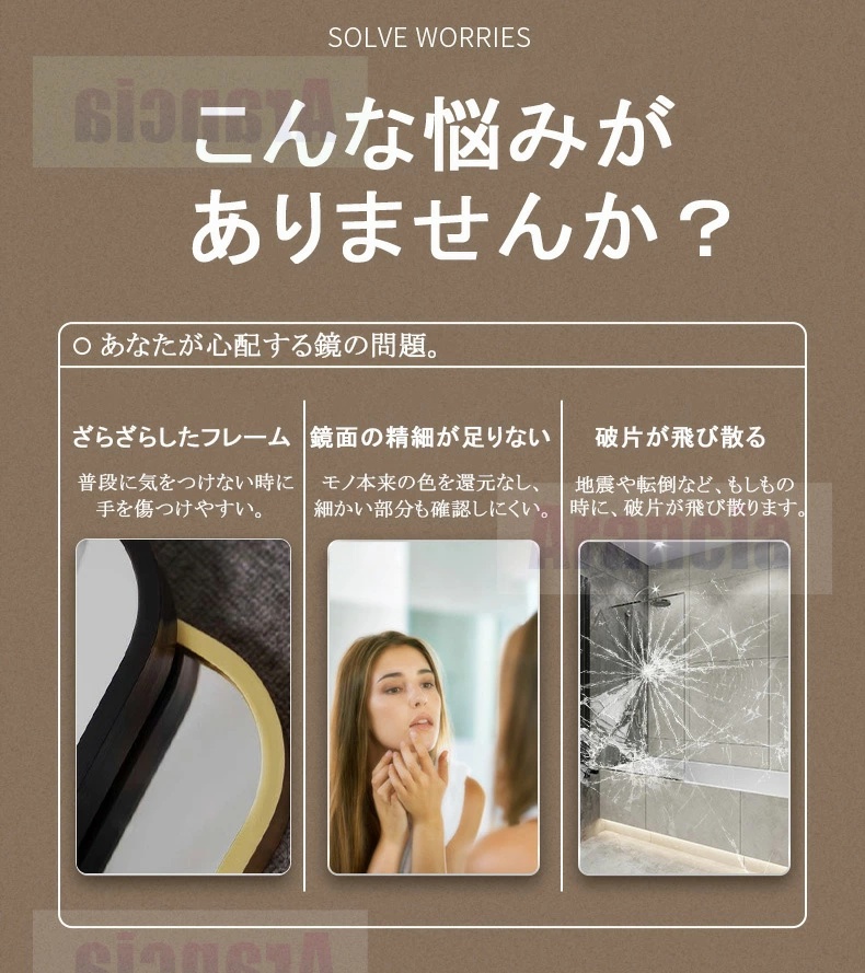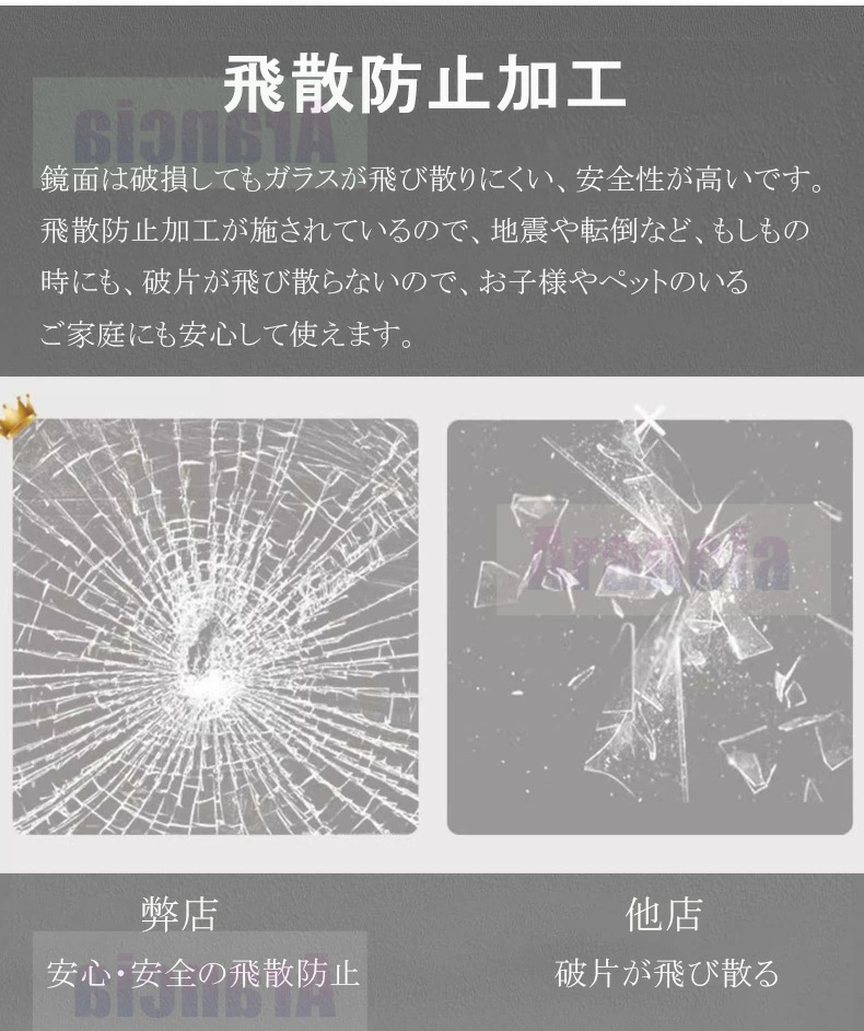 ・特に注目すべきは、飛散防止加工が施されている点です。万が一ミラーが割れてしまった場合でも、ガラス片が飛び散るのを防ぎ、安全性を高めています。これにより、家庭内はもちろん、公共の場や商業施設でも安心してご使用いただけます。