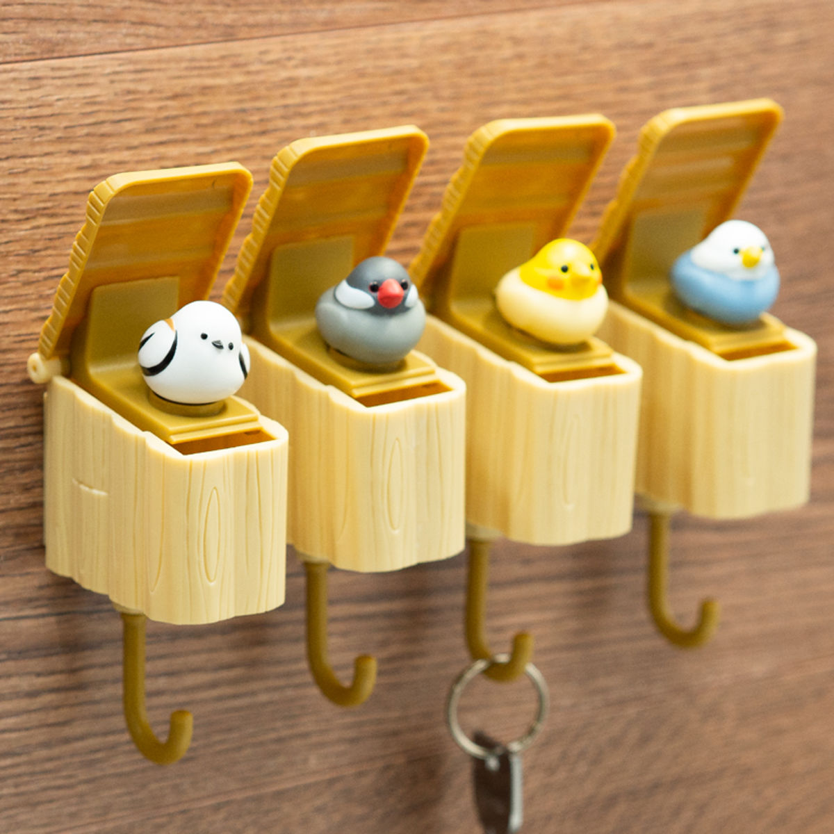 フックを軽く引くと、巣箱のフタがパカッと開き、中から小鳥がちょこんと顔を出すキーフックです。何気ない毎日の帰宅時間が、ちょっと楽しみになります。
