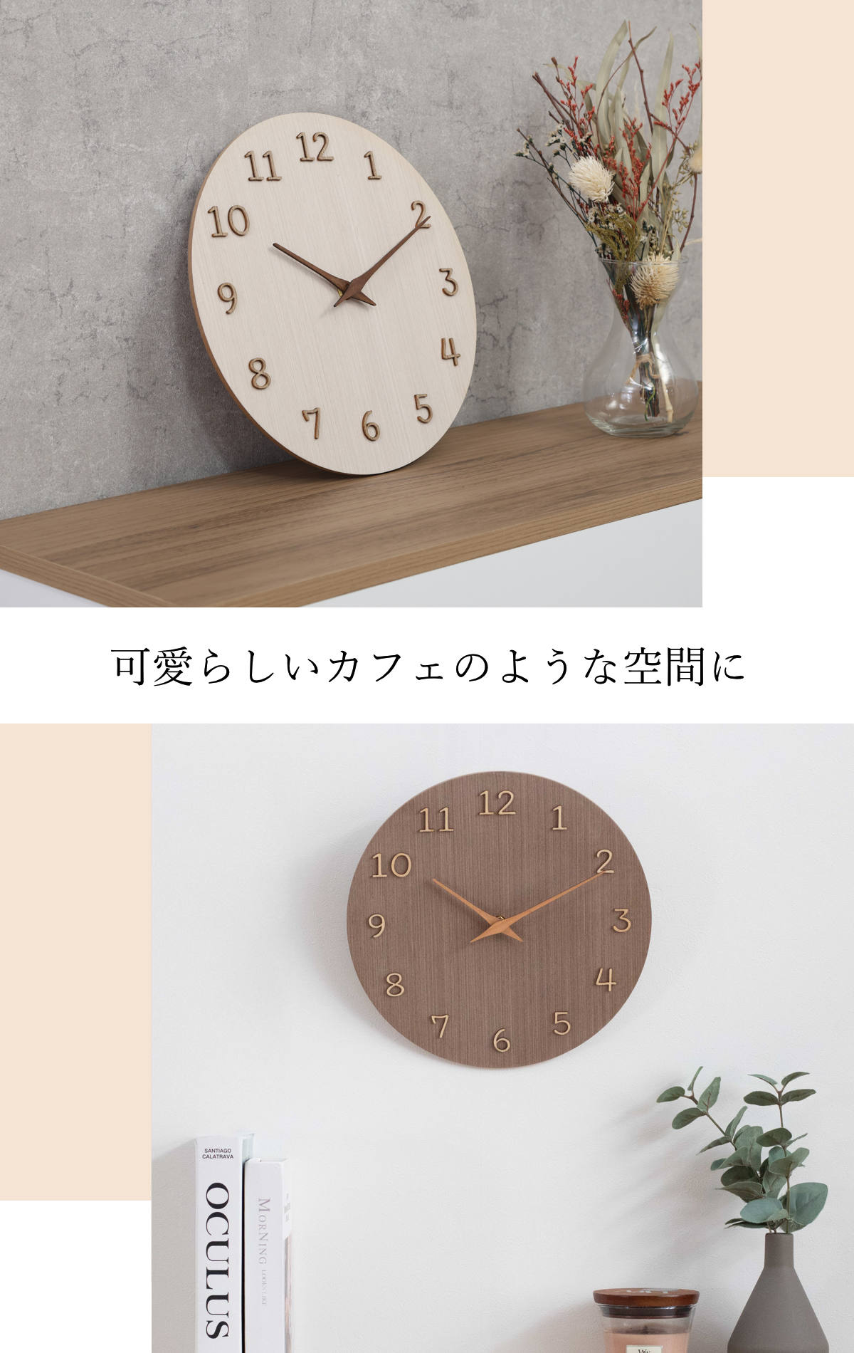 秒針がないシンプルなデザインで、時を刻む音もほとんど気になりません。静かな空間でも心地よく使える、やさしい時間の流れを感じられます。