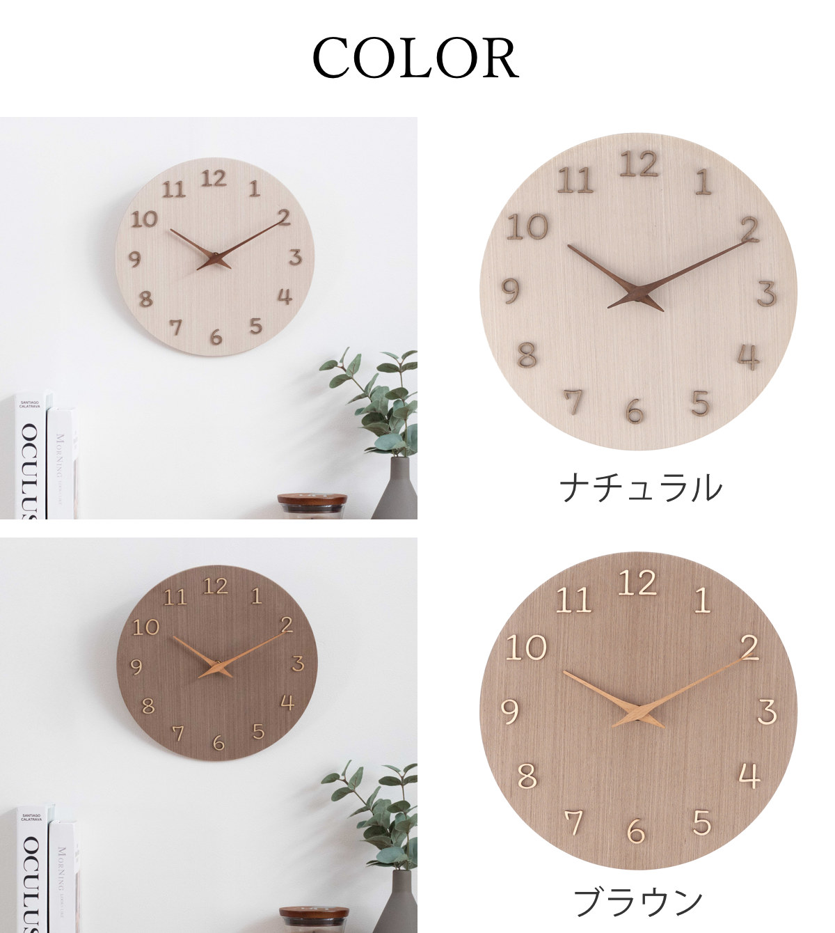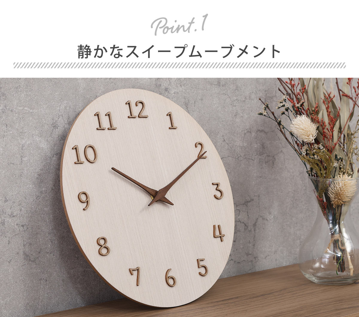 立体的に浮き上がった数字が、やさしく目を引くデザインが魅力です。シンプルな文字盤に程よい表情を添え、空間をナチュラルに彩ります。