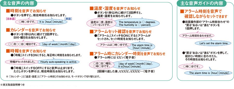 機能=電波修正機能(40kHz/60kHz自動選局・受信OFF機能つき)、音声報時(時刻・カレンダー・温湿度)、音声アラーム、アラームオートストップ機能(約5分間)、スヌーズつき、音量切替(大・小)、アラームモニター機能、ライトつき、2099年までのフルオートカレンダー機能、温湿度表示(温度測定範囲:0℃〜40℃ 測定精度:±2℃ 湿度測定範囲:25%RH〜85%RH 測定精度:±8%(25℃))、12時間制/24時間制切替式、オートスピーキング機能(1分毎に15分間)、バイリンガル(英語・日本語)切替