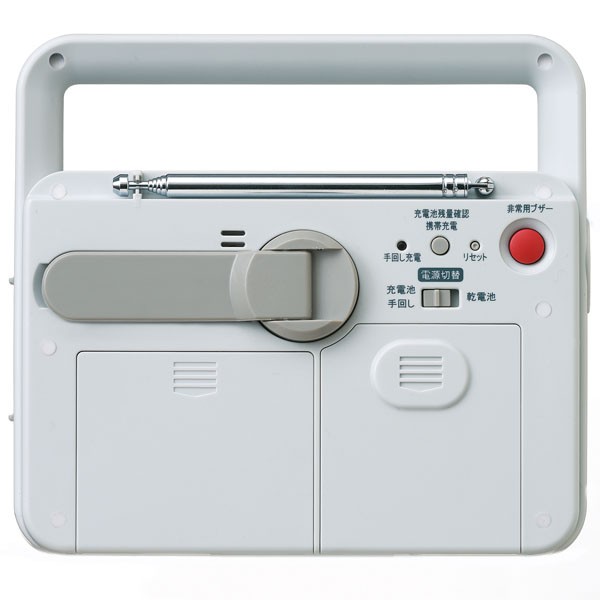 裏面のハンドルを回して充電した内蔵電池は、時計・ラジオ・LEDライト・非常用ブザーに使用でき、スマートフォン・携帯電話も充電できます。※1