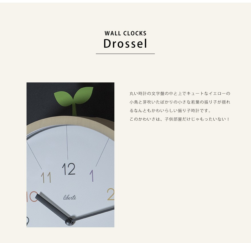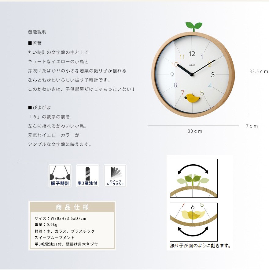 若葉:丸い時計の文字盤の中と上でキュートなイエローの小鳥と芽吹いたばかりの小さな若葉の振り子が揺れるなんともかわいらしい振り子時計です。このかわいさは、子供部屋だけじゃもったいない!