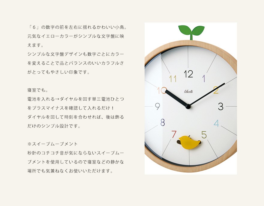 ぴよぴよ:「6」の数字の前を左右に揺れるかわいい小鳥。元気なイエローカラーがシンプルな文字盤に映えます。シンプルな文字盤デザインも数字ごとにカラーを変えることで品とバランスのいいカラフルさがとってもやさしい印象です。