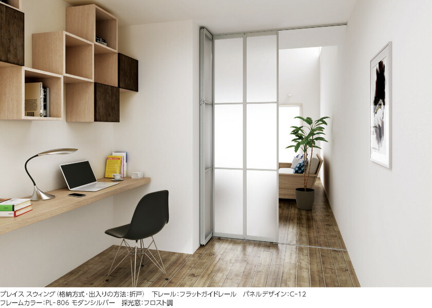 間仕切 プレイス スウィング 折戸格納+折戸出入り 下レール:フラットガイドレール 木目調フレーム パネル:洋風障子デザイン パターンオーダー