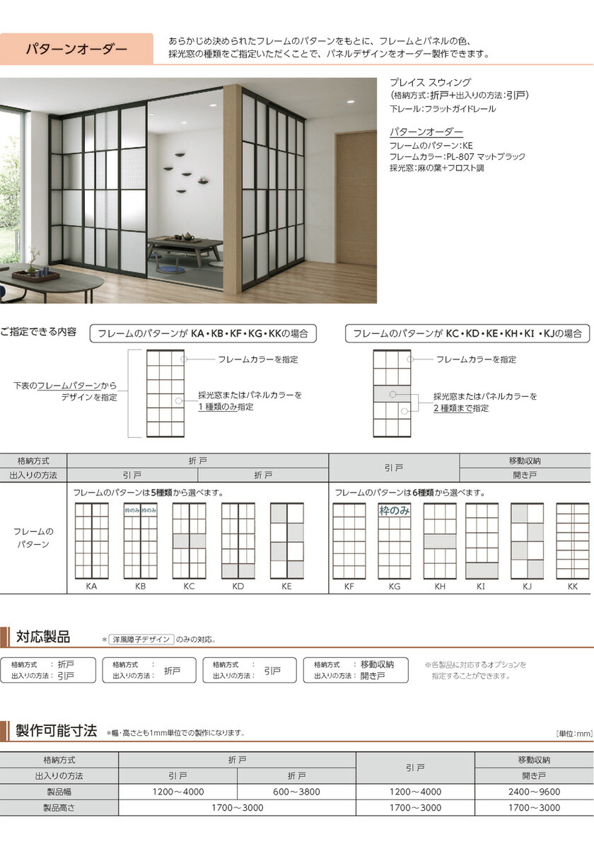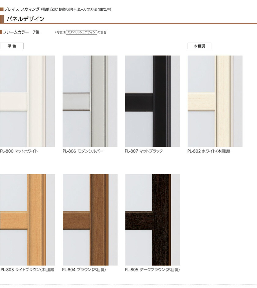 プレイス スウィング移動収納+開き戸出入り 下レール:ノンレール 単色フレーム PL-800・806・807 洋風障子デザイン パターンオーダー