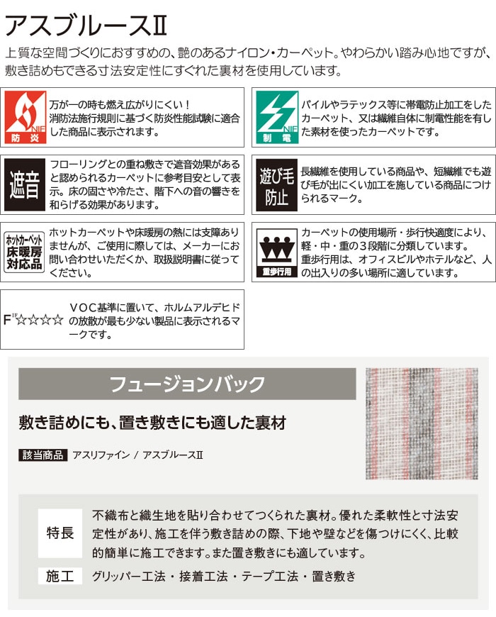 ◆機能:防炎、制電、遮音、重歩行、遊び毛防止、ホットカーペット・床暖房対応、F☆☆☆☆(ホルムアルデヒド対策品)