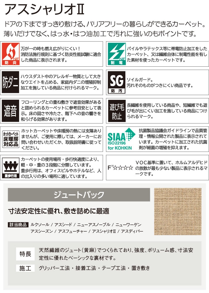 ◆機能:防炎、制電、遮音、重歩行、防ダニ、SIAA抗菌、防汚(SG)、遊び毛防止、ホットカーペット・床暖房対応、F☆☆☆☆(ホルムアルデヒド対策品)