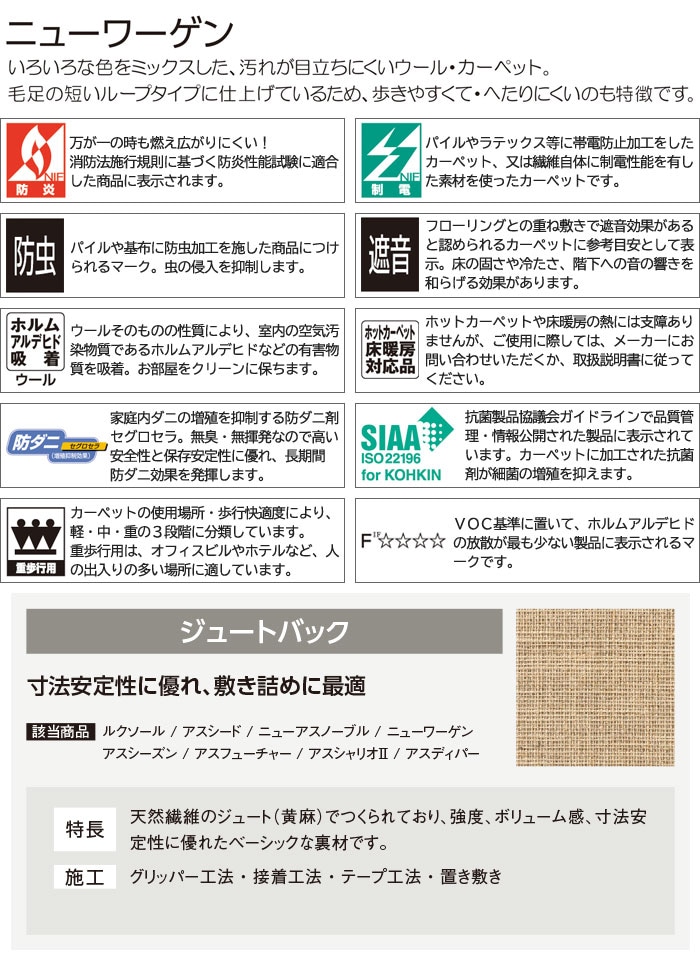 ◆機能:防炎、制電、遮音、防虫、防ダニ、重歩行、SIAA抗菌、VOC吸着(ウール)、ホットカーペット・床暖房対応、F☆☆☆☆(ホルムアルデヒド対策品)