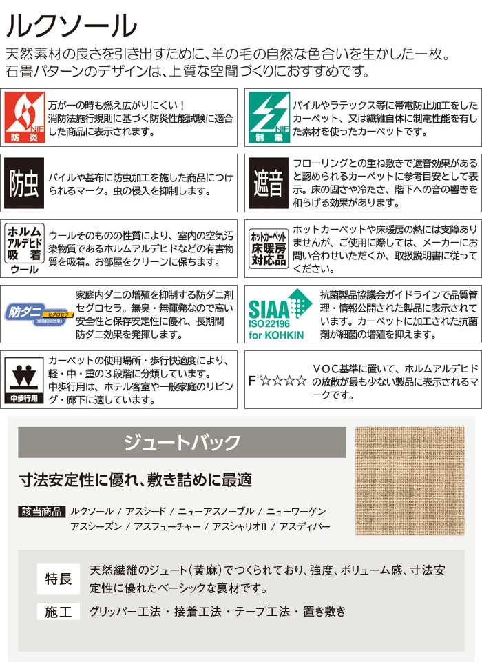 ◆機能:防炎、制電、遮音、防虫、防ダニ、中歩行、SIAA抗菌、VOC吸着(ウール)、ホットカーペット・床暖房対応、、F☆☆☆☆(ホルムアルデヒド対策品)