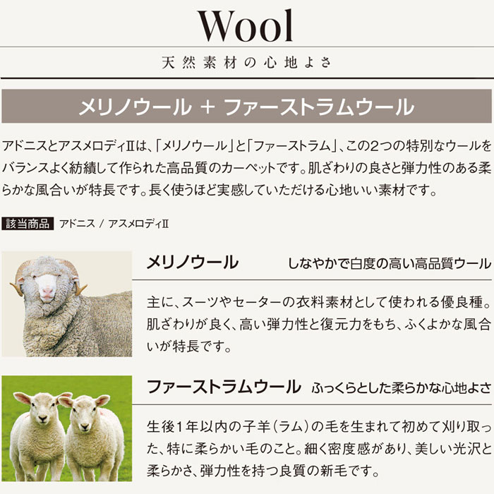 ◆機能:防炎、制電、遮音、防虫、防ダニ、中歩行、SIAA抗菌、VOC吸着(ウール)、ホットカーペット・床暖房対応、広巾テープ対応、F☆☆☆☆(ホルムアルデヒド対策品)