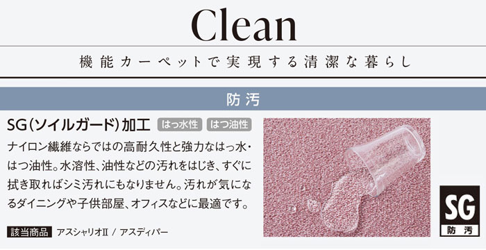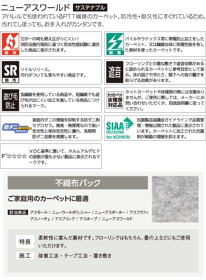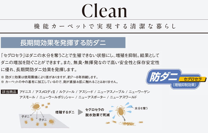 ◆機能:防炎、制電、遮音、防ダニ、SIAA抗菌、防汚(SR)、遊び毛防止、ホットカーペット・床暖房対応、F☆☆☆☆(ホルムアルデヒド対策品)