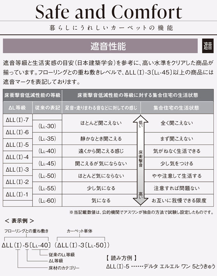 ◆遮音等級:[フローリングの上に敷く場合] △LL(I)-5〔LL-40〕/ [カーペット単体] △LL(I)-1〔LL-60〕