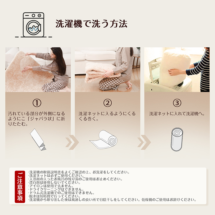 ・洗濯機を利用する際は、30℃までの水温で洗濯用中性洗剤を使用の上、必ず洗濯ネットに入れて”手洗いコース”で洗濯して下さい。