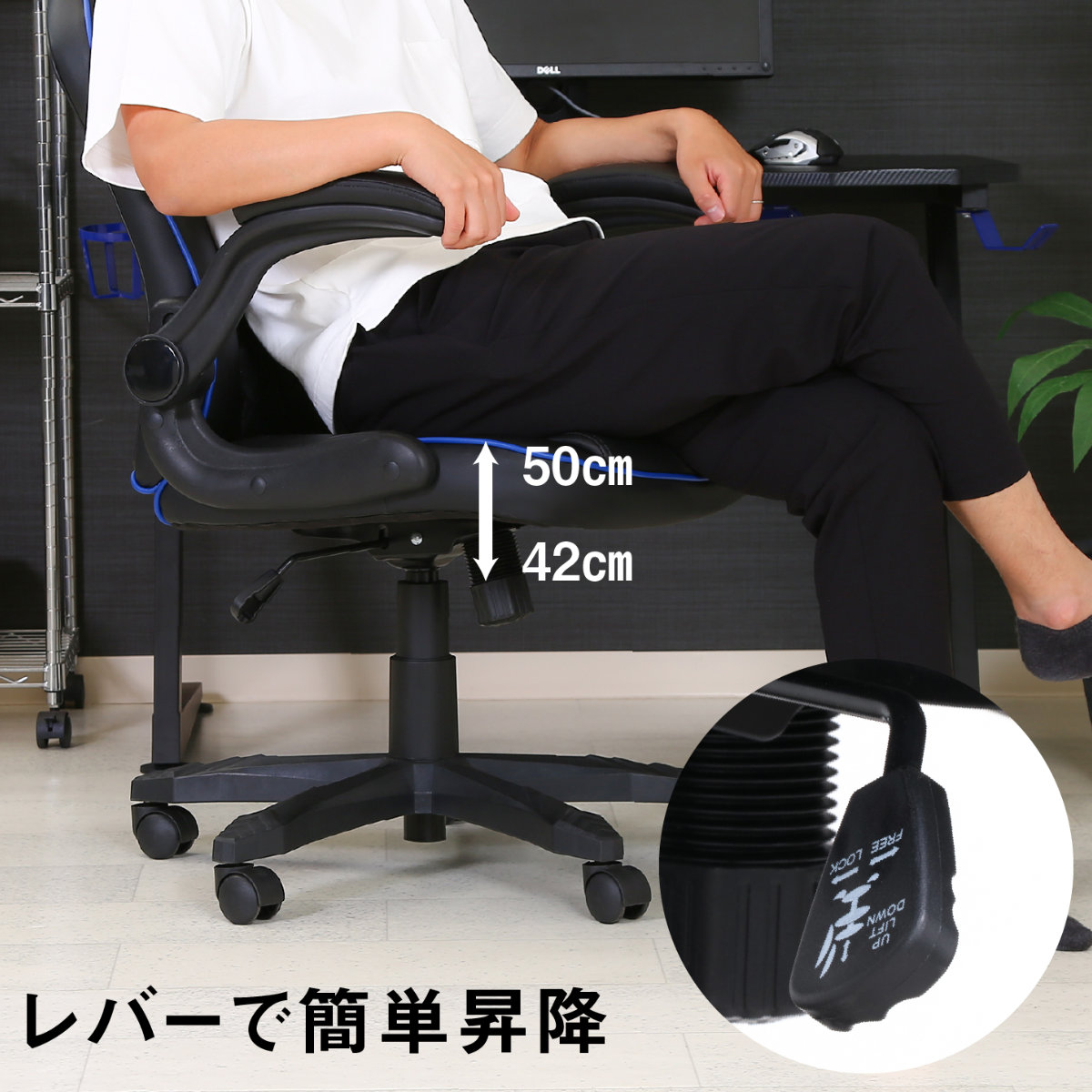 座面下のレバーでデスクや座高に合わせて程よい高さに調節が可能です。