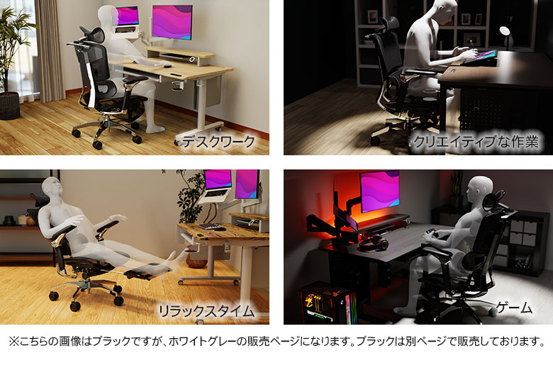 デスクワークはもちろん、前傾姿勢で行うクリエイティブな作業や、リラックスタイムで休憩したい時、ゲームも集中できます。