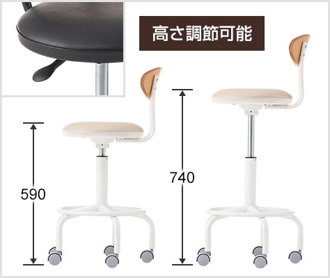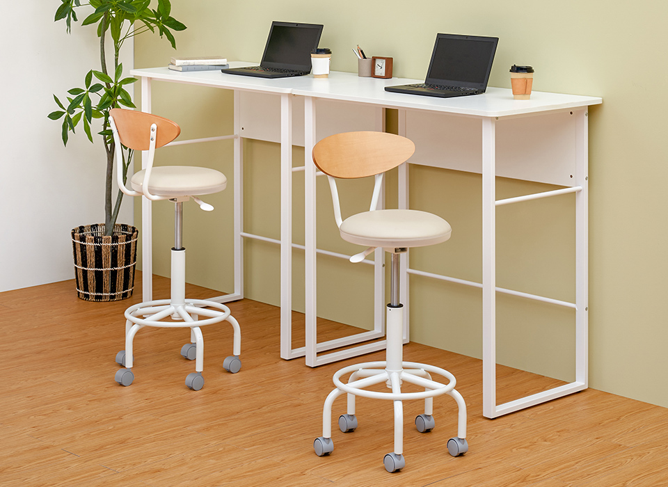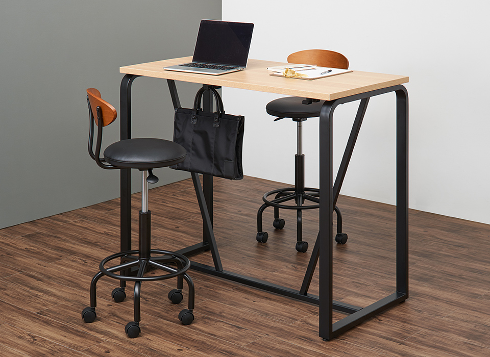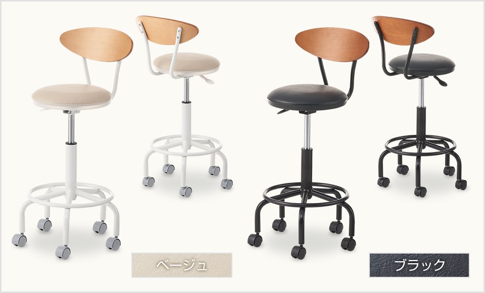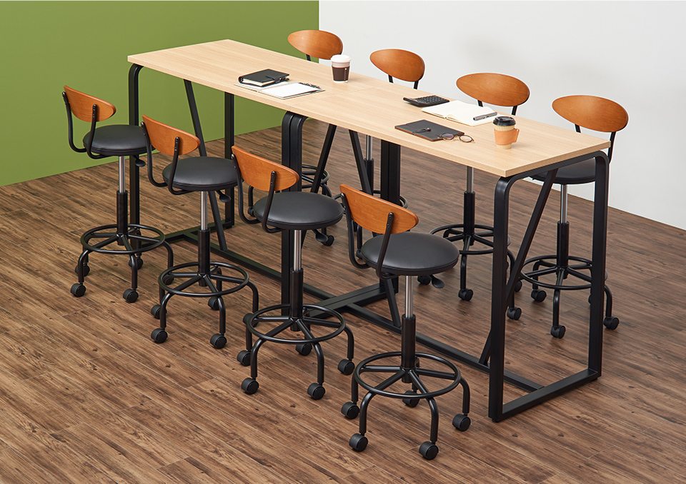 オフィスのスタンディングデスクや休憩室のハイテーブル、店舗やカフェのカウンターテーブルなど、ハイタイプのデスク・テーブルと合わせて使えるハイスツール。木製の背もたれや丸みを帯びた脚部、淡いベージュとシックなブラックはナチュラルな空間に馴染むので、デザインオフィスやコワーキングスペースにもおすすめです。レバーで簡単に昇降可能、移動や小回りも簡単にできるキャスター付き。足置きは使いやすいリング状です。